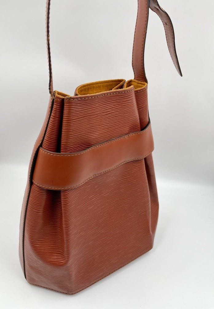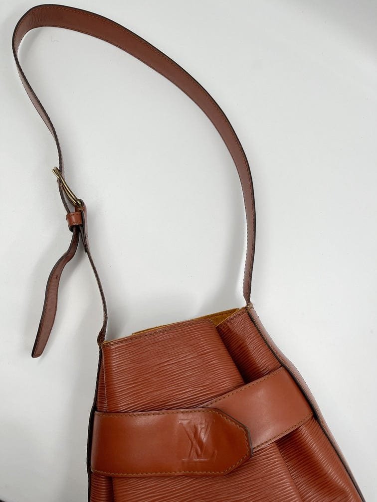 A stunning Louis Vuitton tan Sac D’epaule Epi leather shoulder bag. The bag is accessed by a leather strap embossed with the LV logo that is wrapped around the top of the bag and secured with a press stud. It can be carried on the shoulder with the wide adjustable shoulder strap. Inside is lined with a tan suede lining.