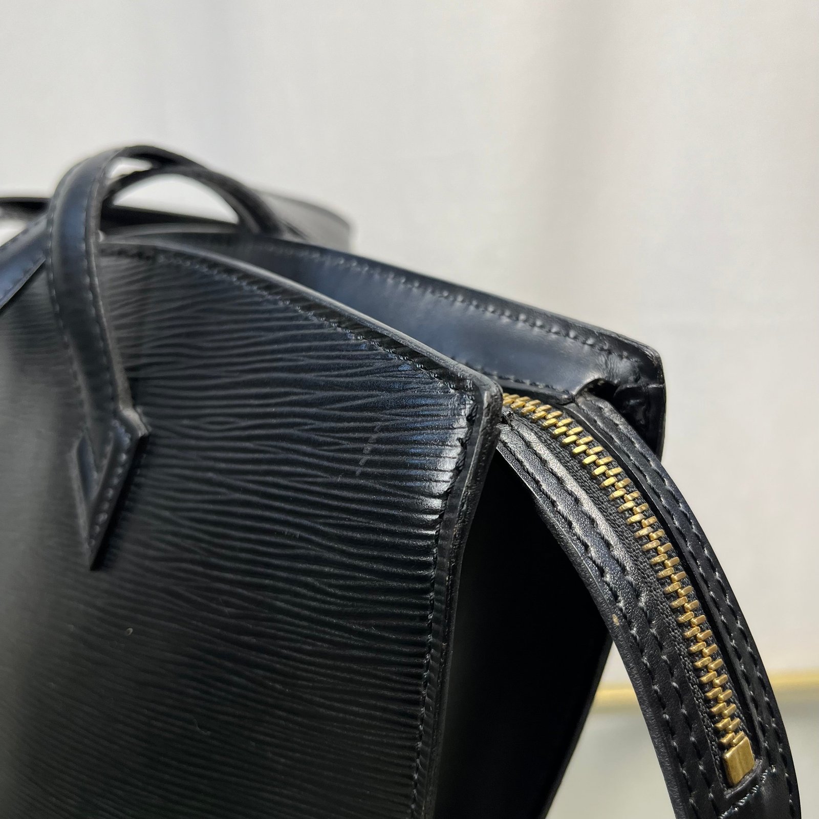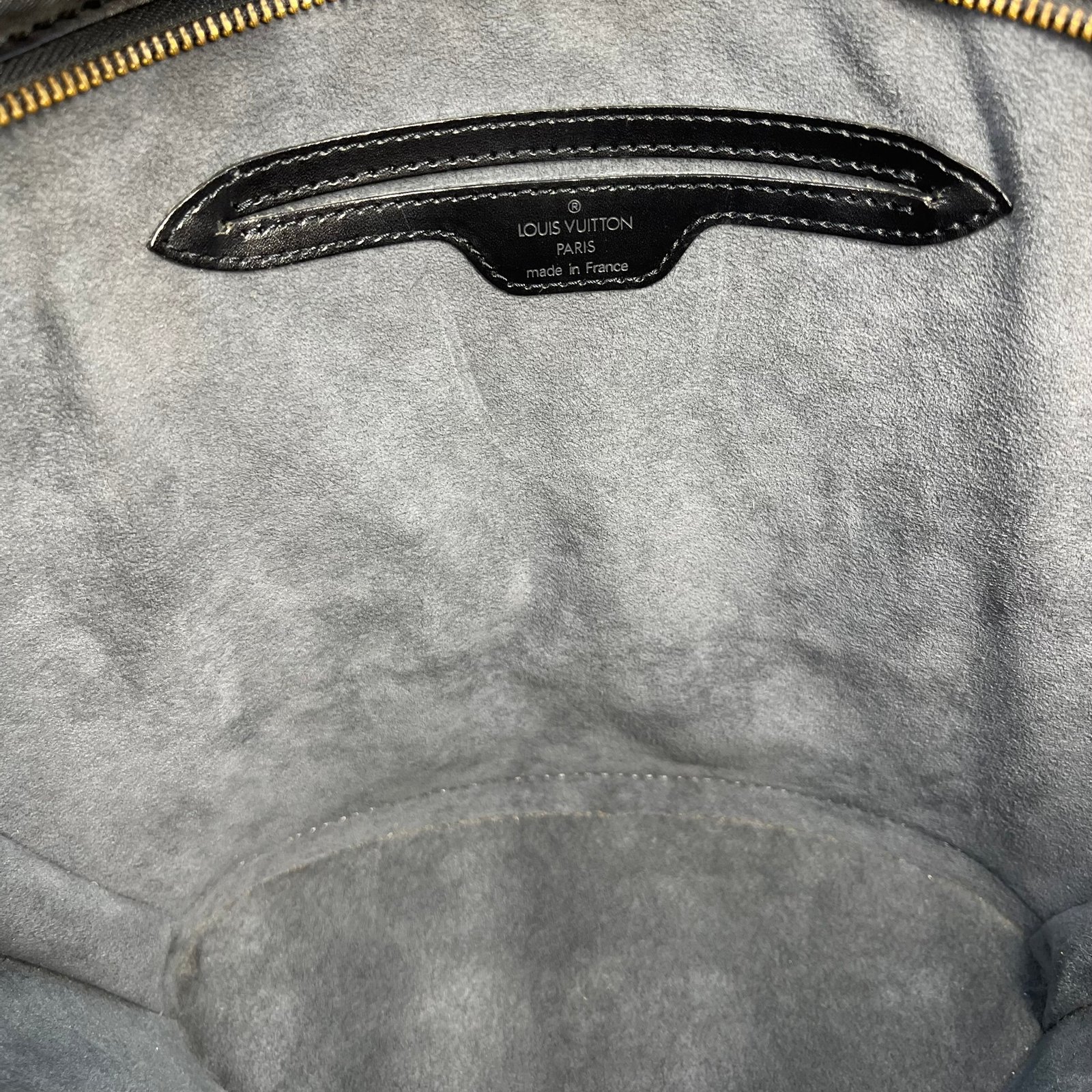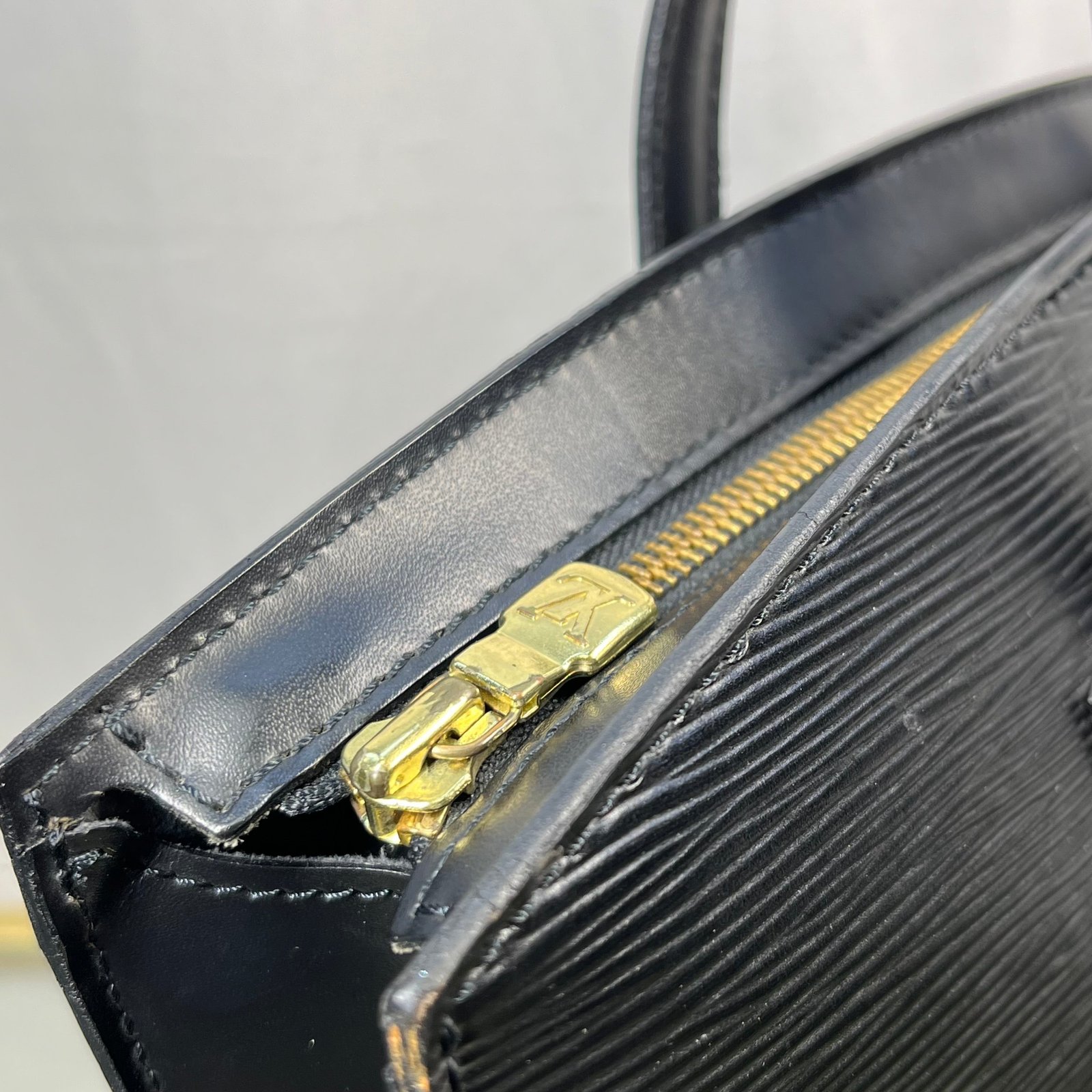This Louis Vuitton Black Epi Leather Top Handle bag is a timeless classic, made from durable and luxurious Epi leather. Featuring a sleek design with an overextended top zipper, the bag provides easy access to its spacious interior, lined with soft gray microfiber. B+ Very good condition