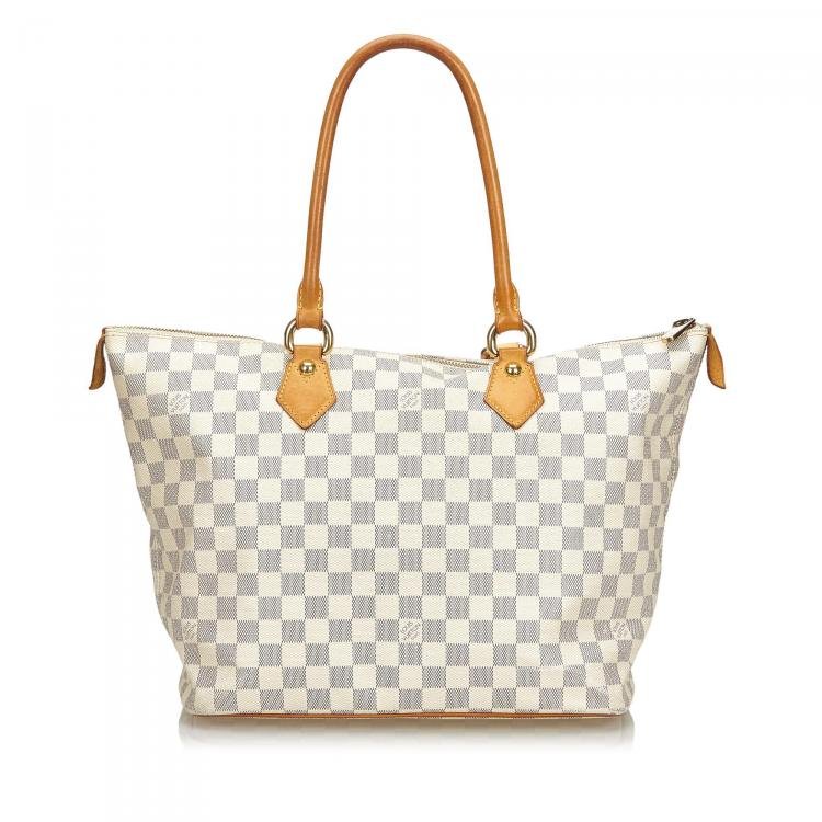 The Saleya MM features the Damier Azur canvas, vachetta straps and trim, side drawstrings, an open top with a lobster claw clasp, and an interior zip pocket.