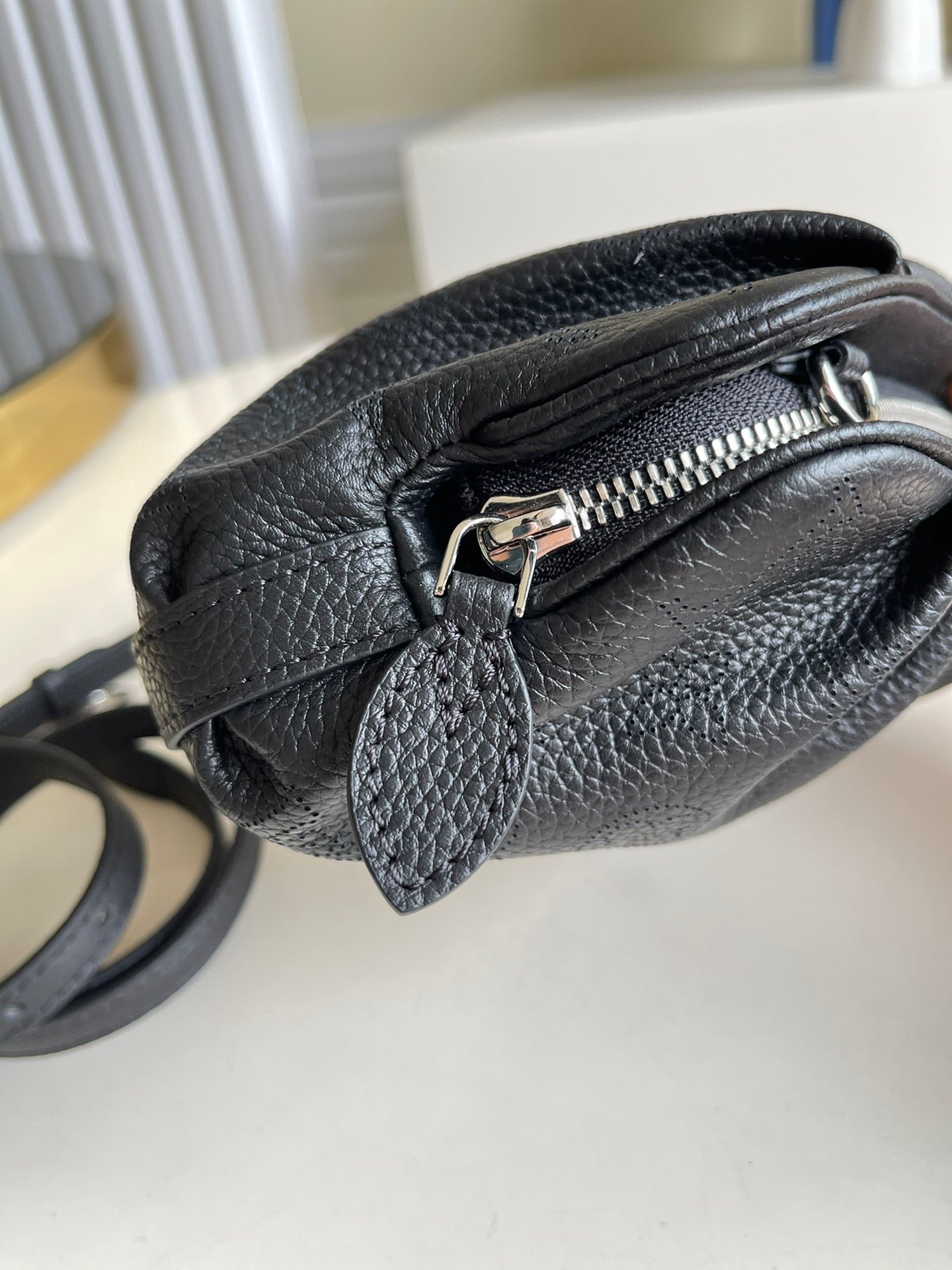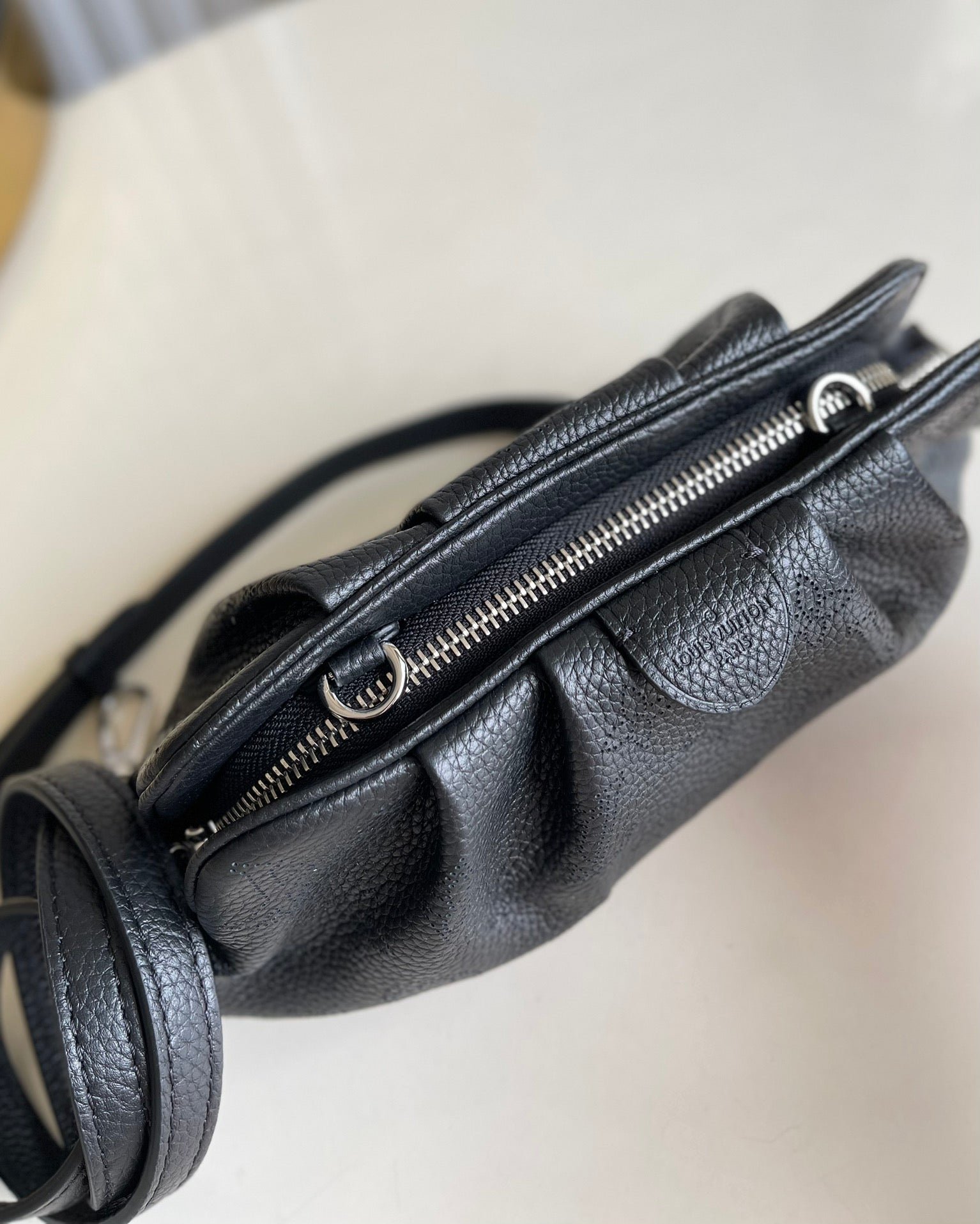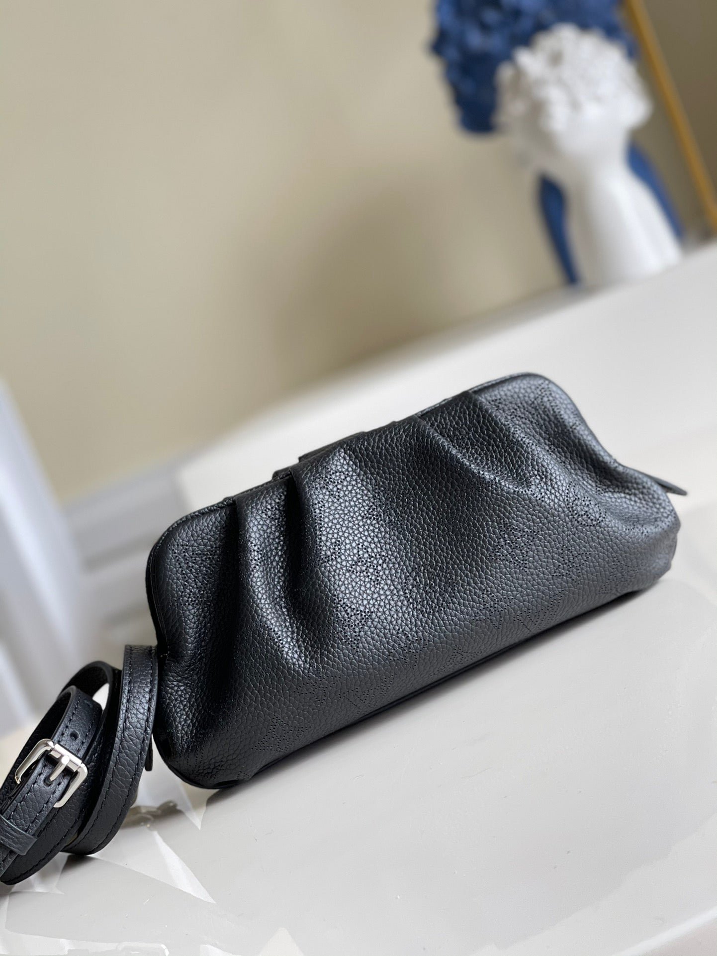The Scala mini pouch has a soft, body-friendly shape inspired by the folds and pleats of drapery. It is crafted from supple Mahina calf leather, whose delicate perforations replicate Louis Vuitton’s iconic Monogram pattern. Large enough to hold everyday essentials, it has a removable, adjustable strap, enabling it to be carried in several different ways.