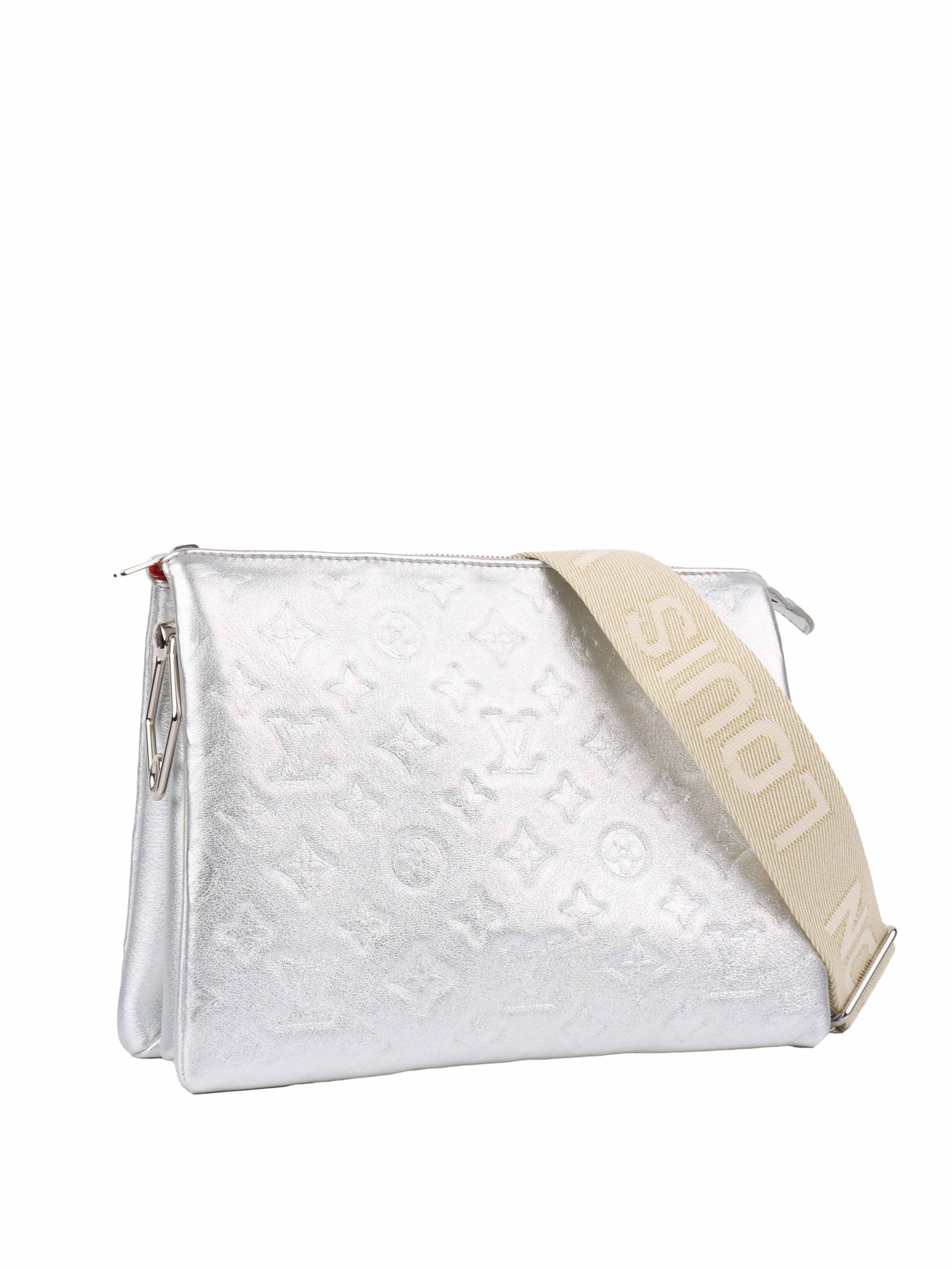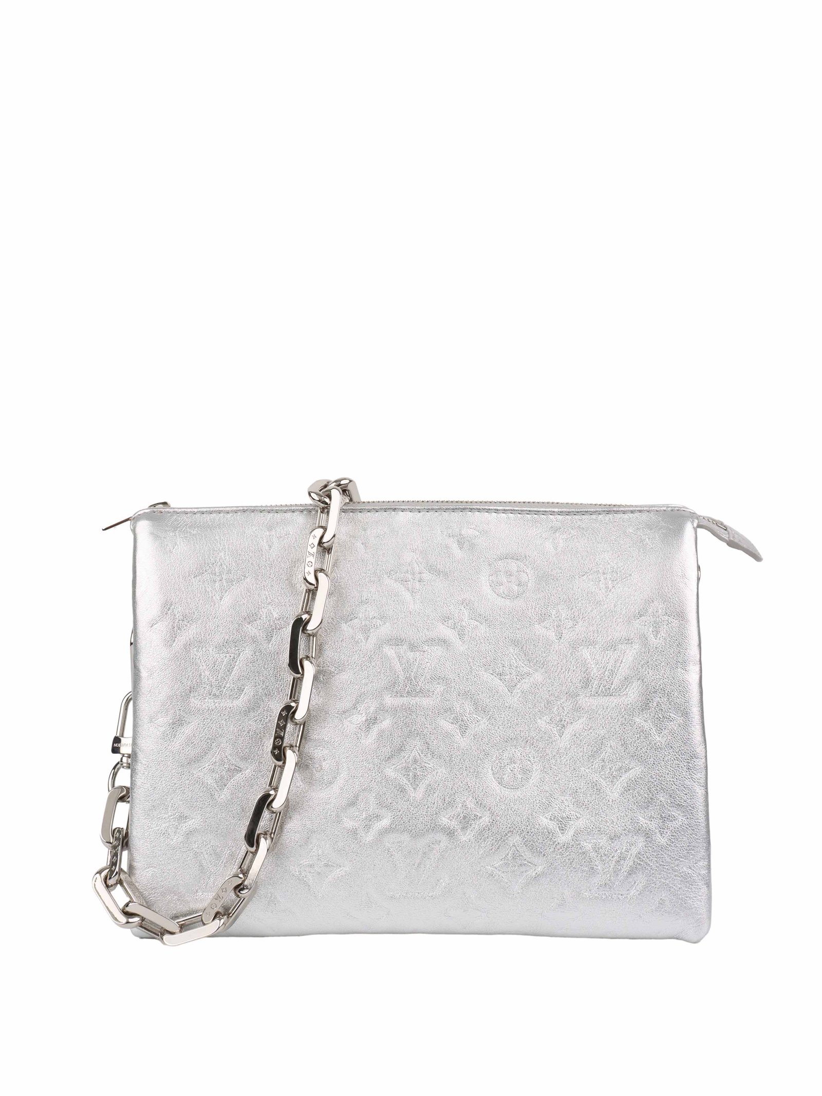 Description : Add a touch of modern glamour to your wardrobe with the Louis Vuitton Silver Coussin BB, a bold and futuristic design from the Maison. Crafted from supple, embossed Monogram leather in a striking metallic silver finish, this compact bag effortlessly blends edgy style with everyday practicality.