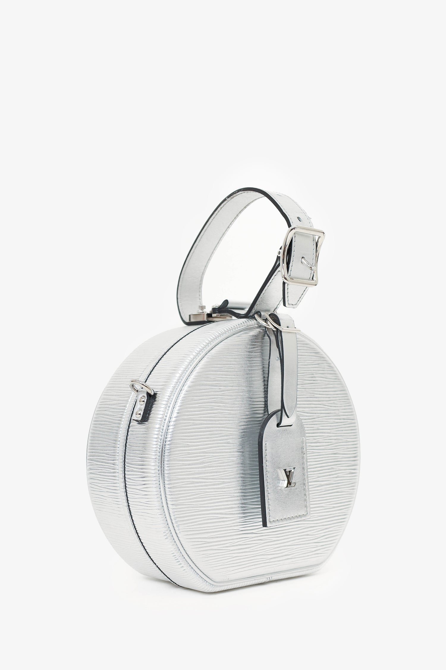 Louis Vuitton Silver Metallic Epi Petite Boite Chapeau with Strap. Top push-lock closure. Top handle with adjustable pull-through buckle closure strap. Removable/adjustable crossbody strap. Open suede interior with single wall slip pocket. Attached dog tag. Protective studs on bottom. Silver-tone hardware. Tonal stitching.
