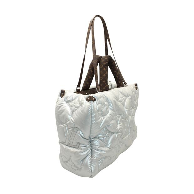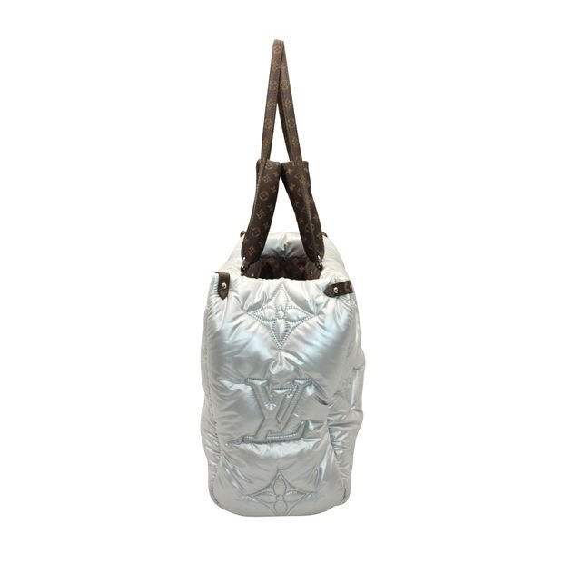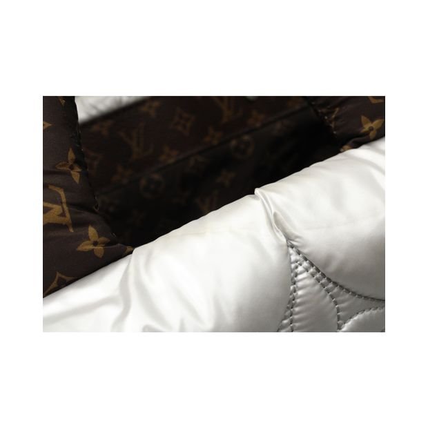 The tote is crafted from silvery padded nylon with embroidered Monogram motifs.