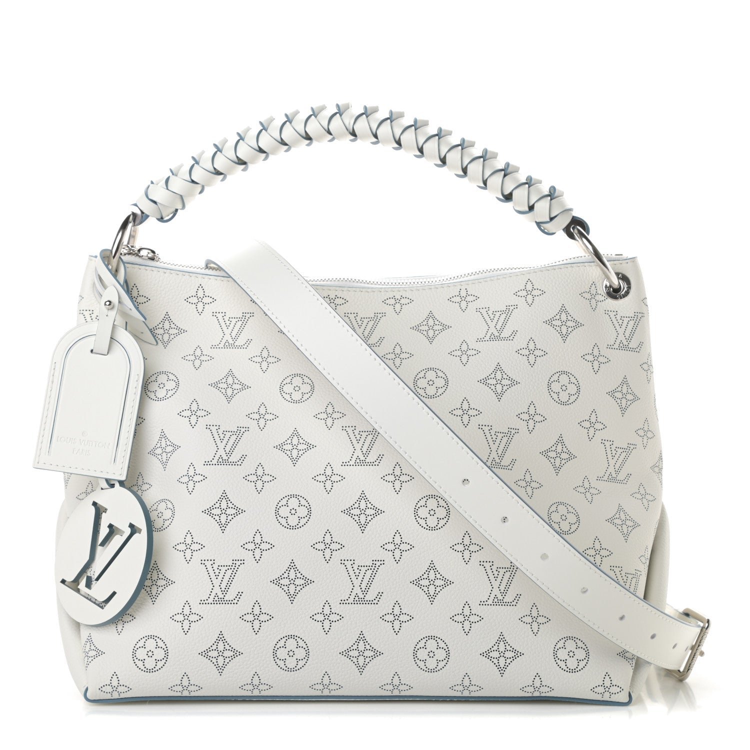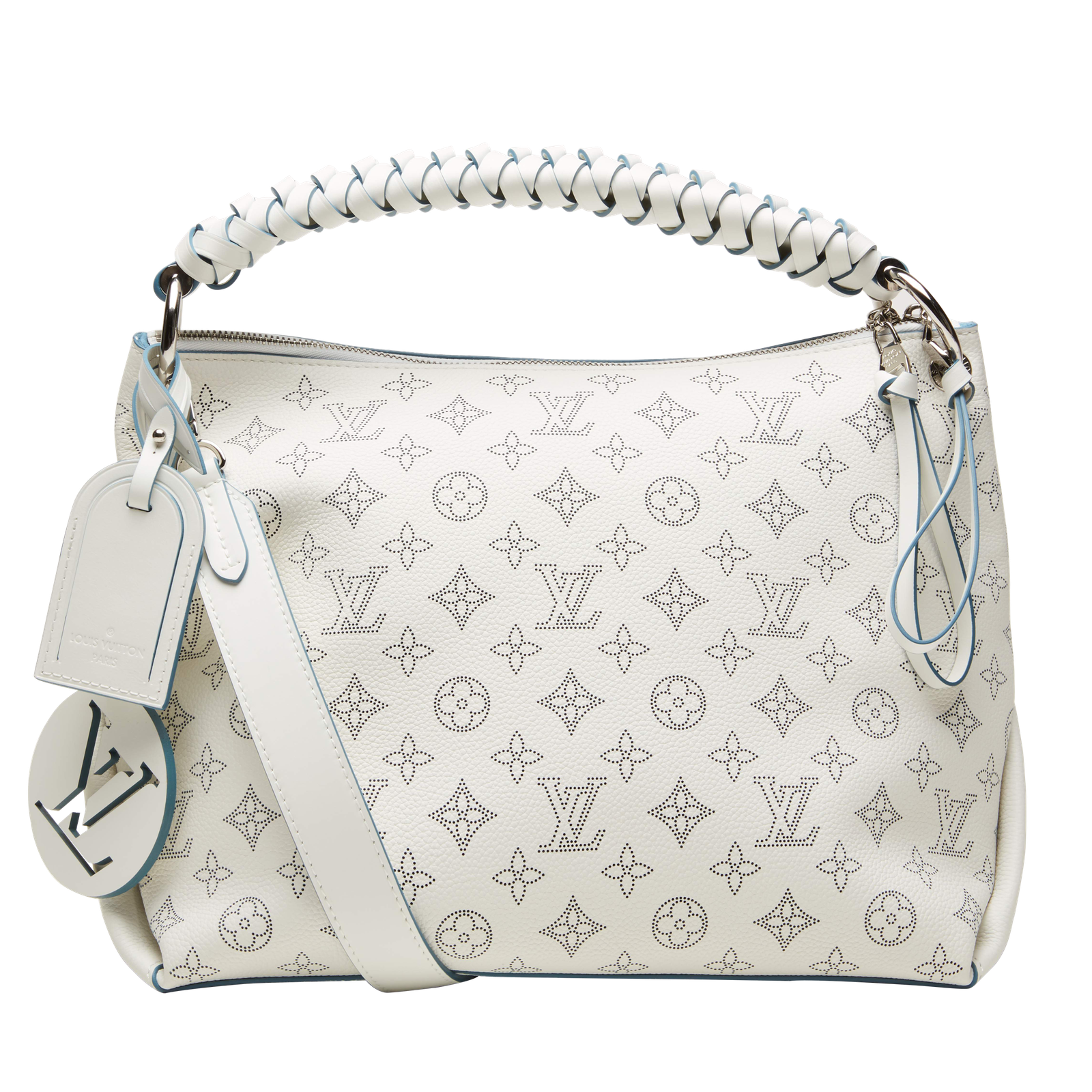 - Exterior in Mahina calf leather perforated with the Monogram pattern, braided-leather top handle with hand-painted edge dyeing along the braids, double zip closure with leather pulls, and oversized LV charm
