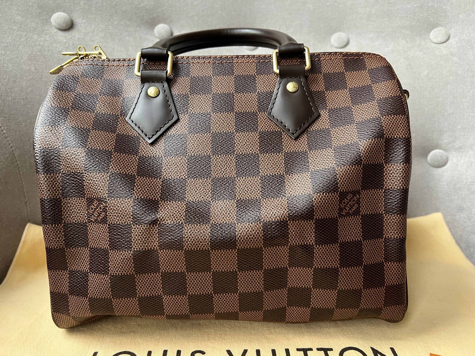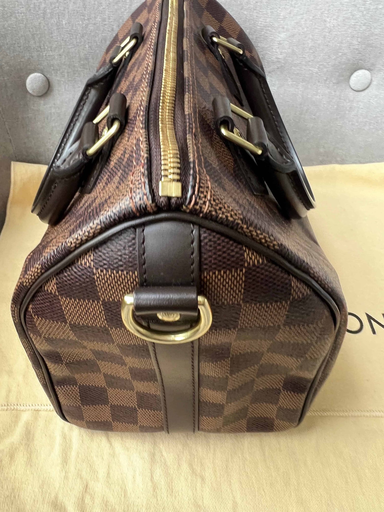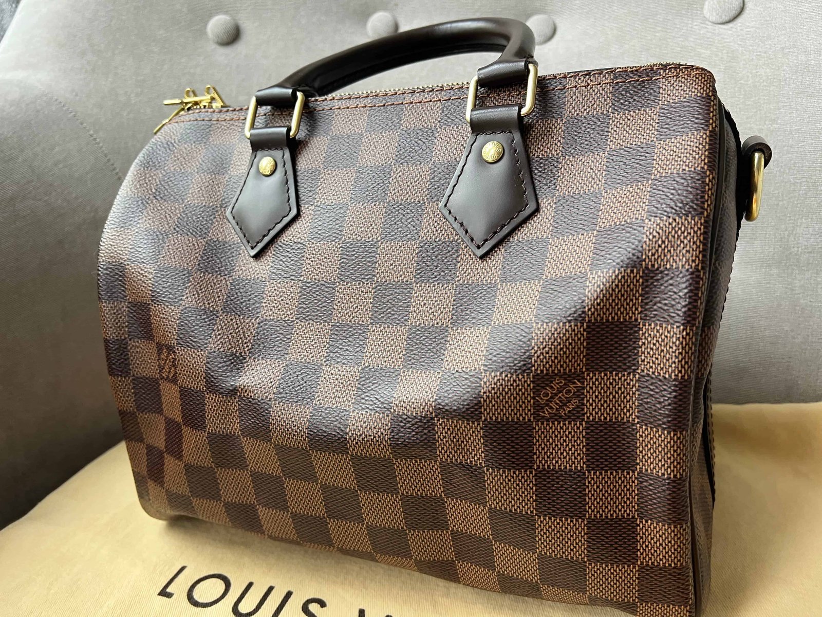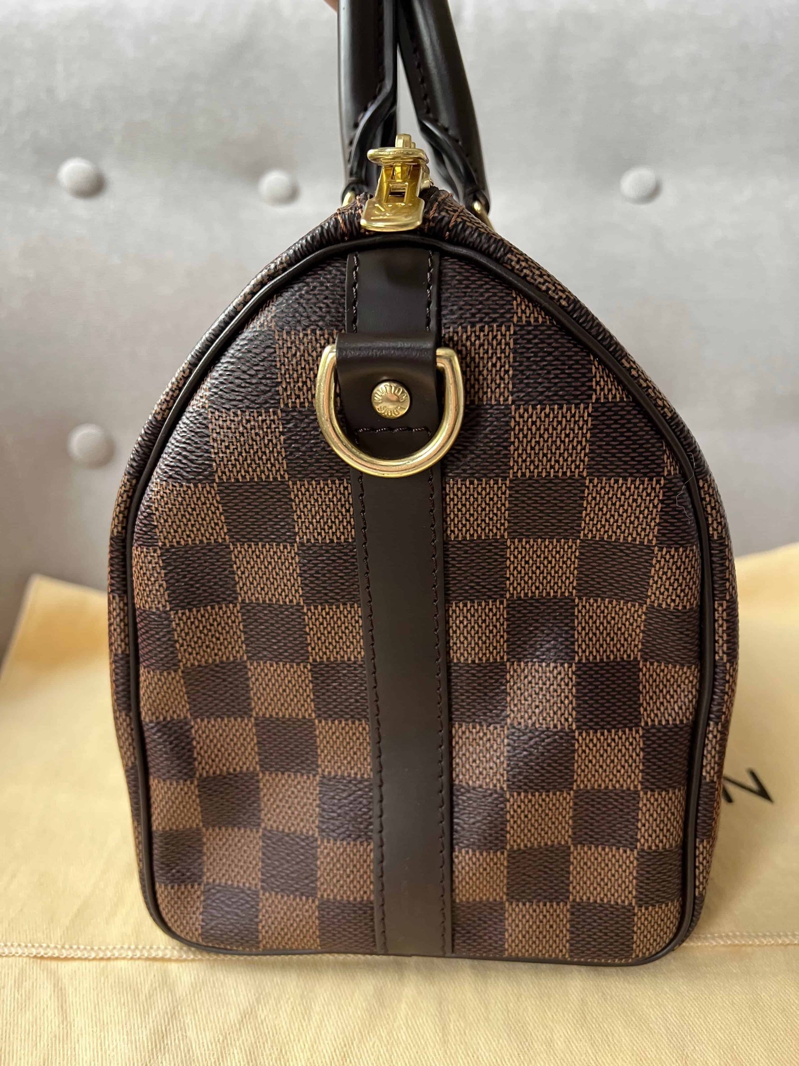 Louis Vuitton Speedy 25 Bandouliere in Damier Ebene canvas with gold hardware. Note the long strap is missing. The classic speedy Bandouliere style is one of Louis Vuitton’s most popular styles and is often sold out online and in store. This style is timeless and elegant and is perfect for day to day use. Slightly slouchy in shape, the Speedy features rolled leather handles and signature padlock together with detachable strap. Can be carried in hand or cross body.