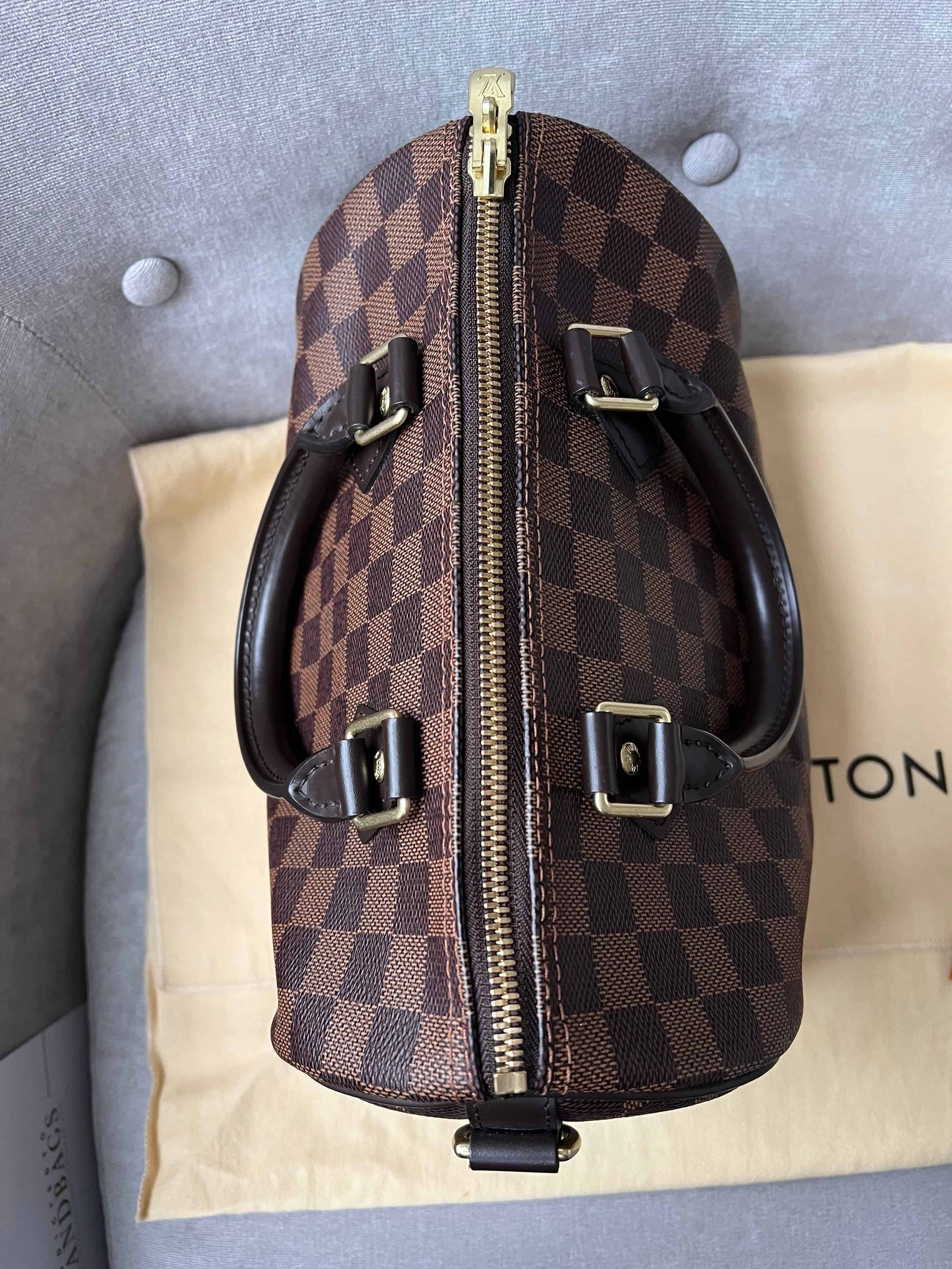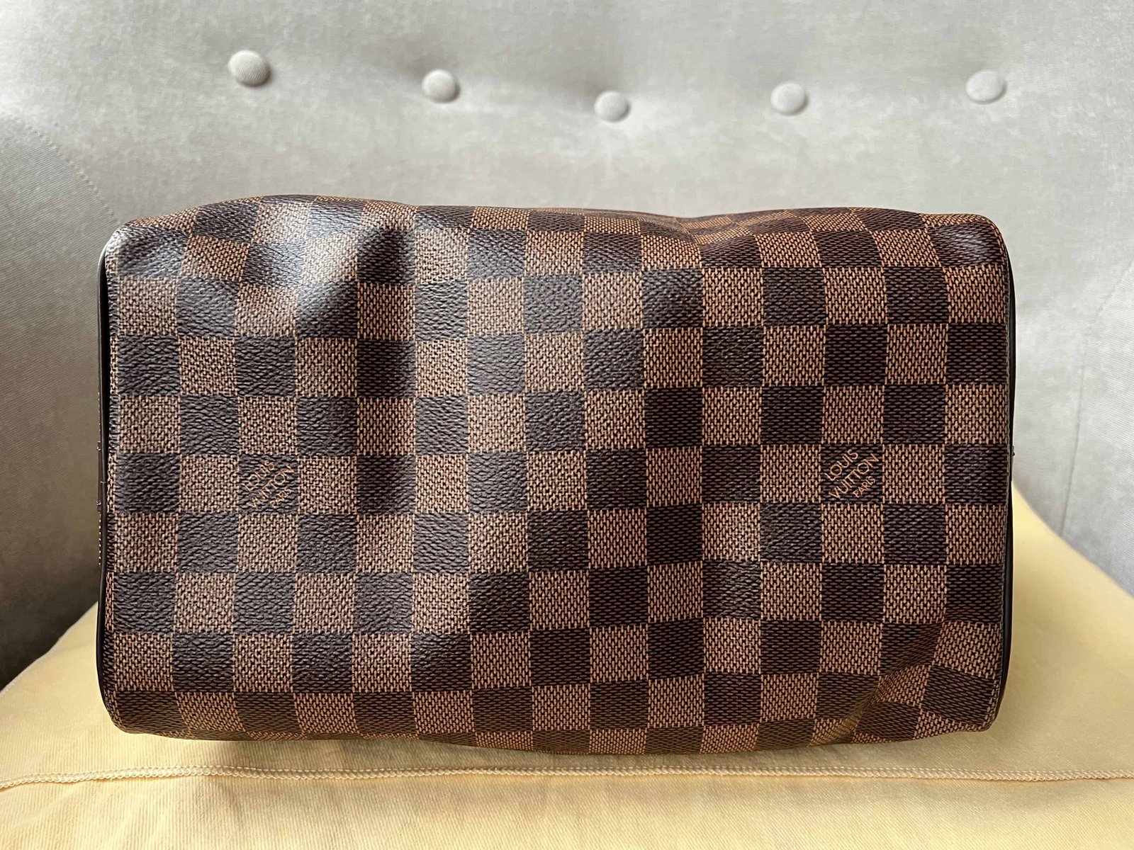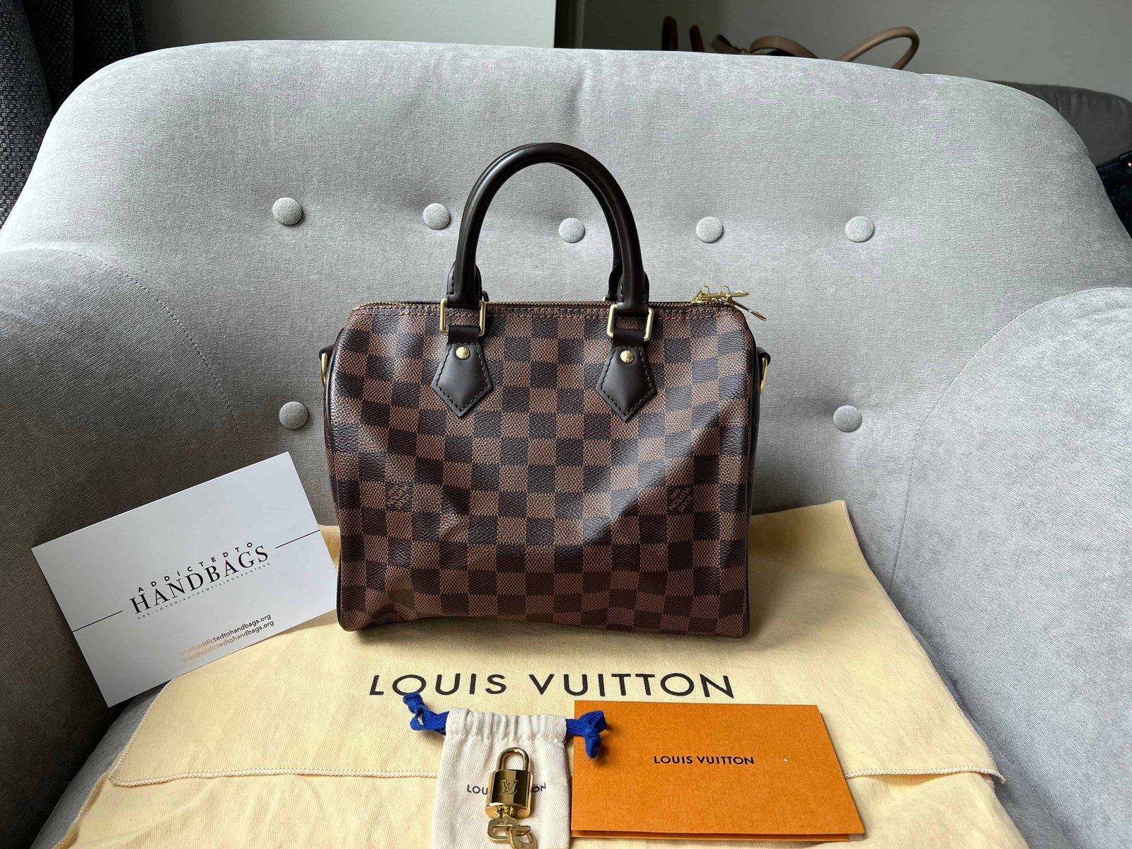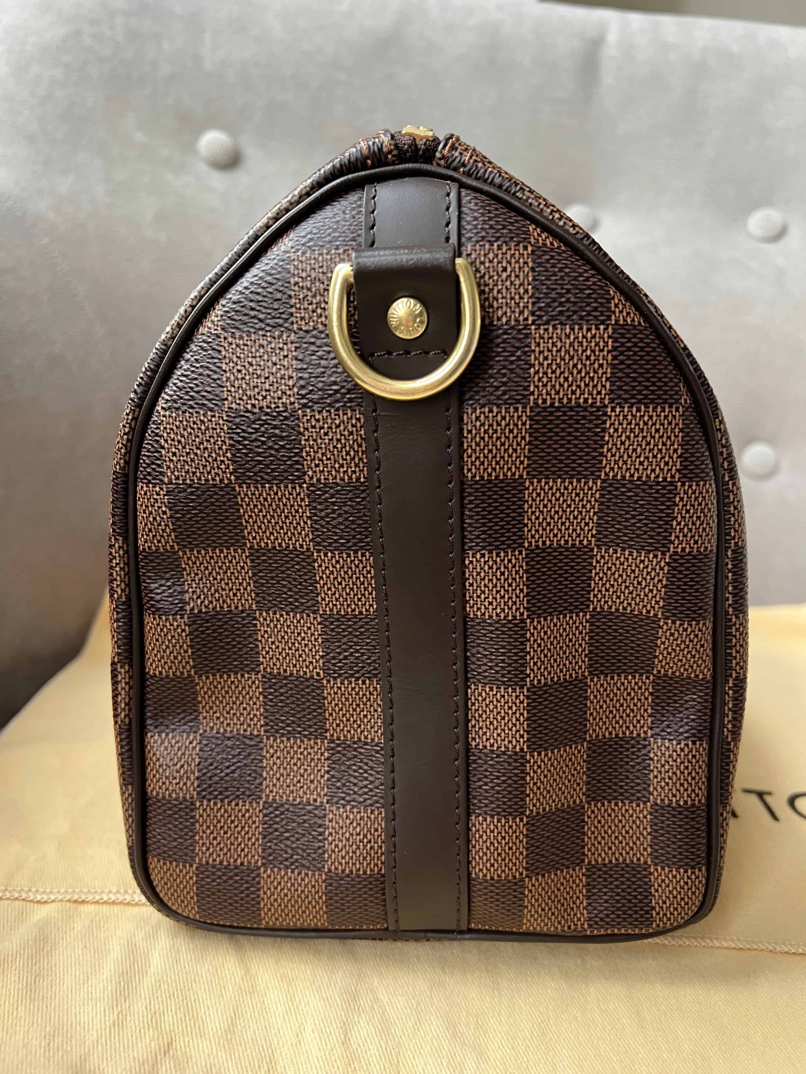 Louis Vuitton Speedy 25 Bandouliere in Damier Ebene canvas with gold hardware. Note the long strap is missing. The classic speedy Bandouliere style is one of Louis Vuitton’s most popular styles and is often sold out online and in store. This style is timeless and elegant and is perfect for day to day use. Slightly slouchy in shape, the Speedy features rolled leather handles and signature padlock together with detachable strap. Can be carried in hand or cross body.