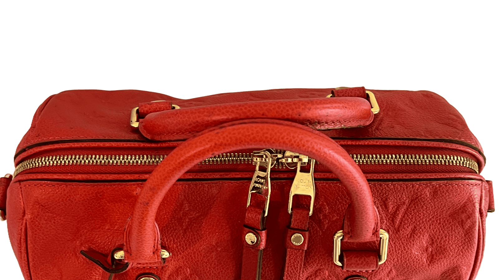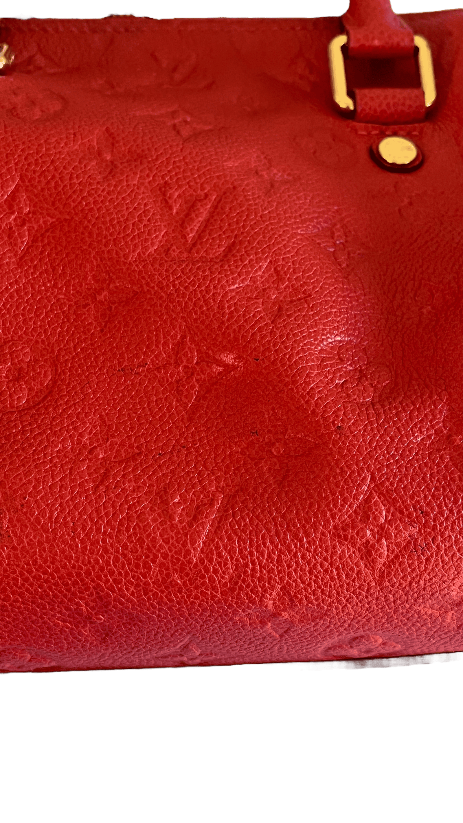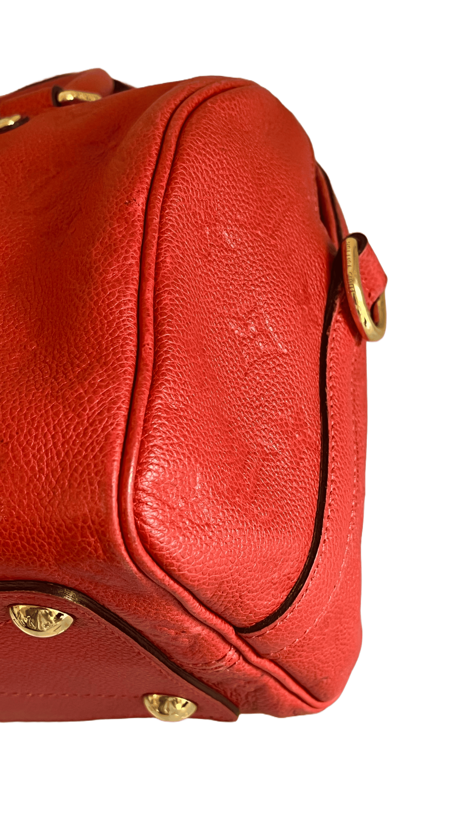 FEATURES: Orange monogram empreinte embossed leather exterior; double rolled top handles; detachable clochette; gold tone hardware; two-way zip closure to main compartment; orange textile lined interior with 1 x zipped pocket and 2 x flat pockets.