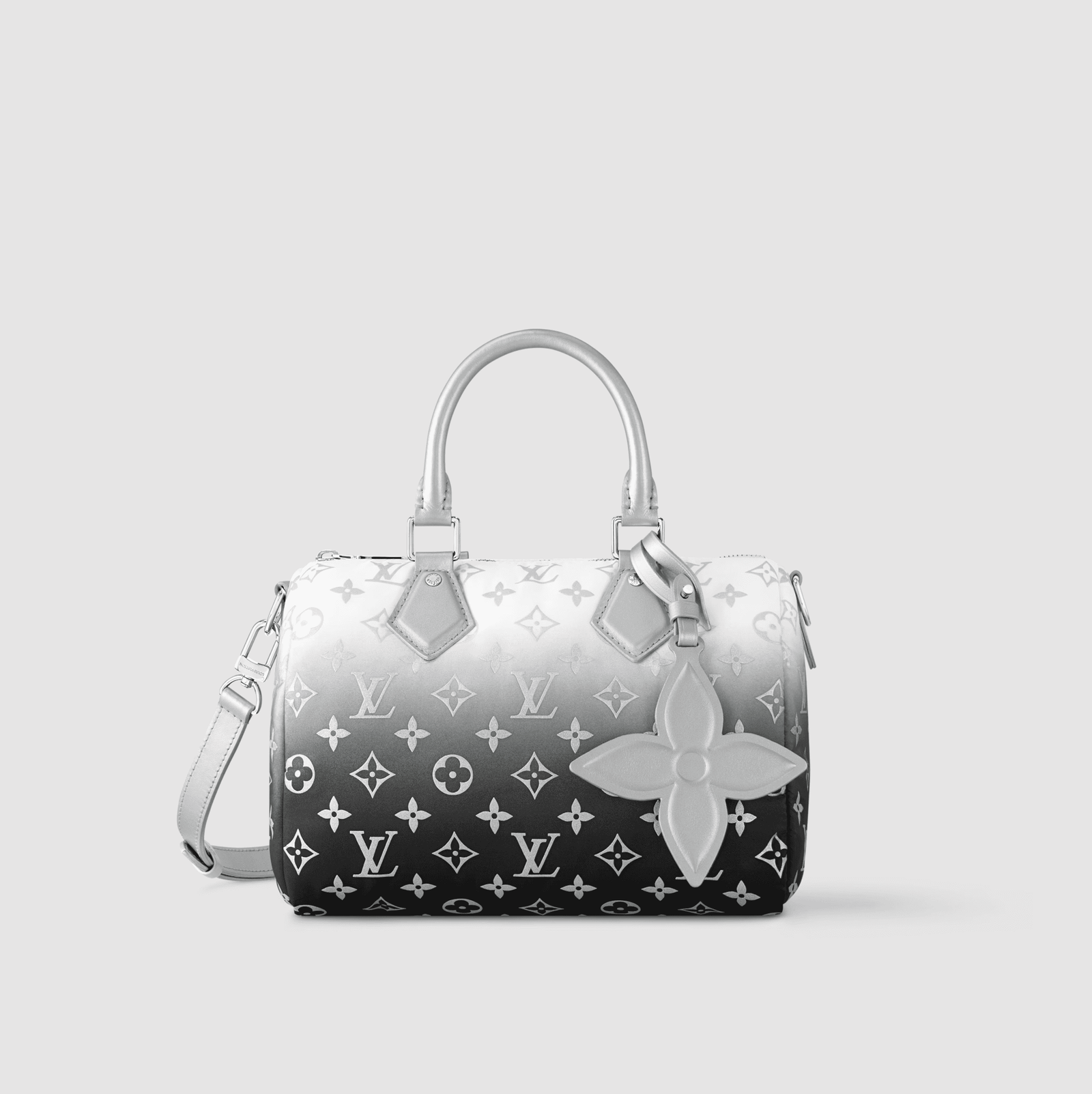 Characteristics: This Speedy Bandoulière 25 is part of the LV Snow collection, which introduces the House’s all-new Monogram Nylon in a gradient silver finish. The compact style is elevated with silver-toned hardware and includes a signature flower charm. It is sized to store essential items such as a phone, wallet and keys, and offers multiple carry options thanks to the additional removable and adjustable strap.