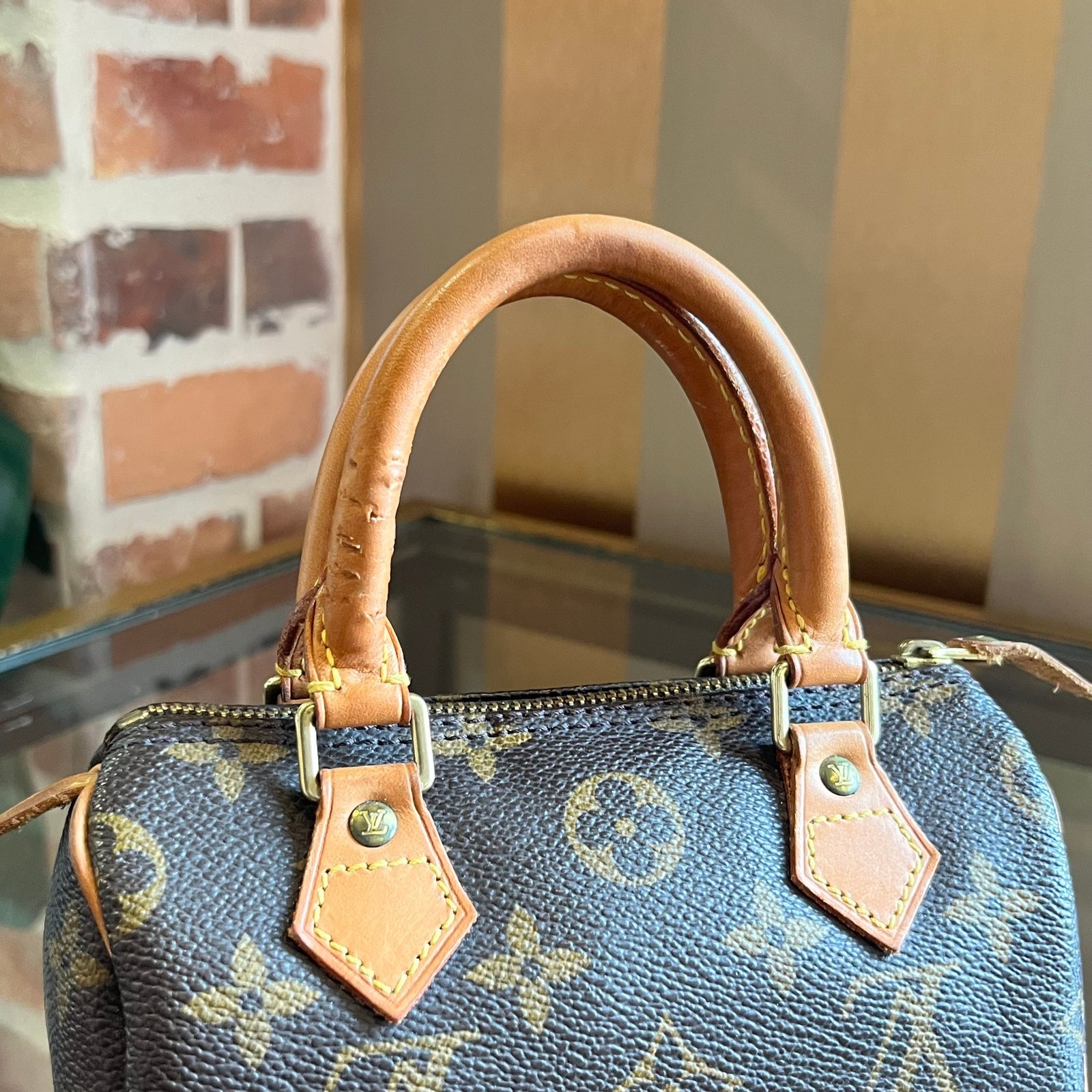 - Handle: The vachetta leather has developed a rich caramel patina, complemented by gentle rubbing, soiling, and natural darkening. Small marks, indentations, and deeper impressions—along with tiny punctures likely from external pressure (please refer to photos)—add to its unique character and story. Despite these details, the handles remain fully usable, as they do not affect the overall integrity or functionality of the bag.