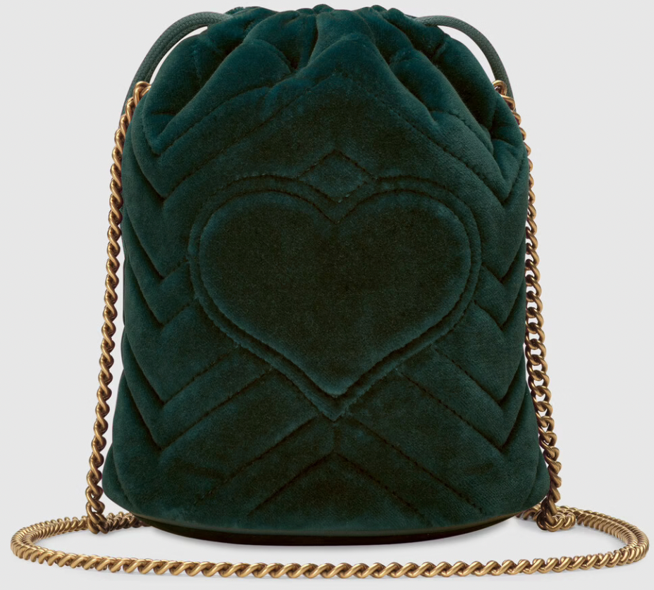 The Gucci Marmont Interlocking GG Logo Mini Bucket Bag with Chain is crafted from chevron velvet in a deep shade of green. Inspired by an archival design from the ’70s—a hallmark era of the House—the Double G decorates the front of this accessory. Featuring a chain strap and drawstring closure the versatile shape can also be worn as a cross body bag.