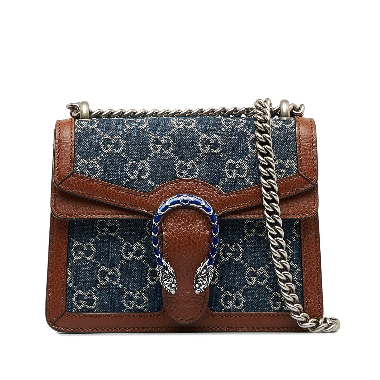 Dionysus, the Greek god of wine and joy, is the inspiration for Gucci’s collection of the same name. The tiger head clasp on the flap of this Bag refers to the legend that Dionysus crossed the Tigris on a tiger sent by Zeus. The horseshoe shape of the buckle, on the other hand, creates a link to equestrian sport, which is very close to the Italian fashion house’s heart. The model is made from blue, coated canvas and has brown leather trims on the sides, base and flap. The Bag can be over the shoulder or crossbody. It has a silver-colored chain strap and a flap with a press stud fastening.
