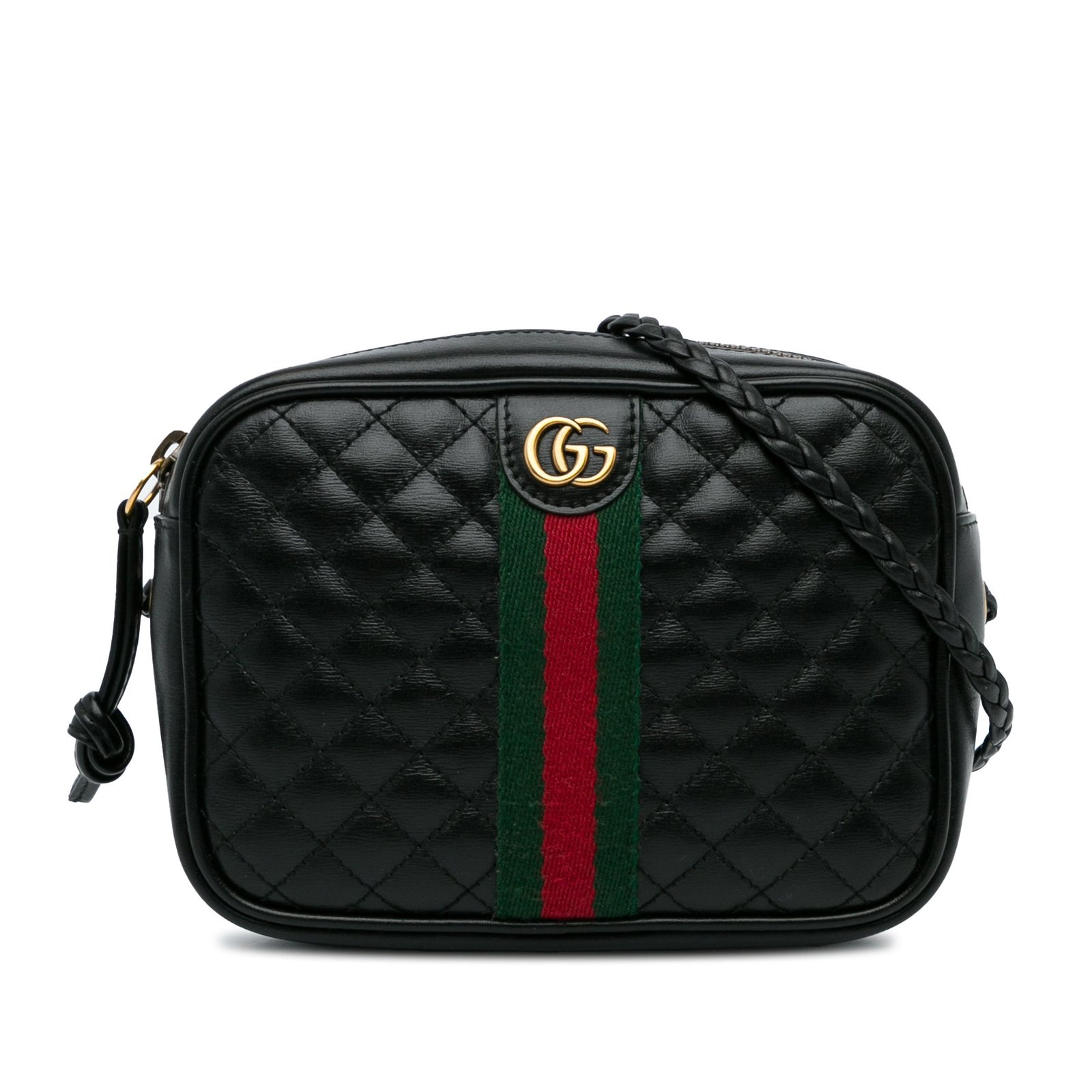 This Gucci Trapuntata crossbody camera bag in mini size is made of black quilted leather with the characteristic Gucci woven stripe. It also features a braided shoulder strap with gold-colored details, a zipper on the top and a slip pocket on the inside. It is best across the body or loosely over the shoulder.