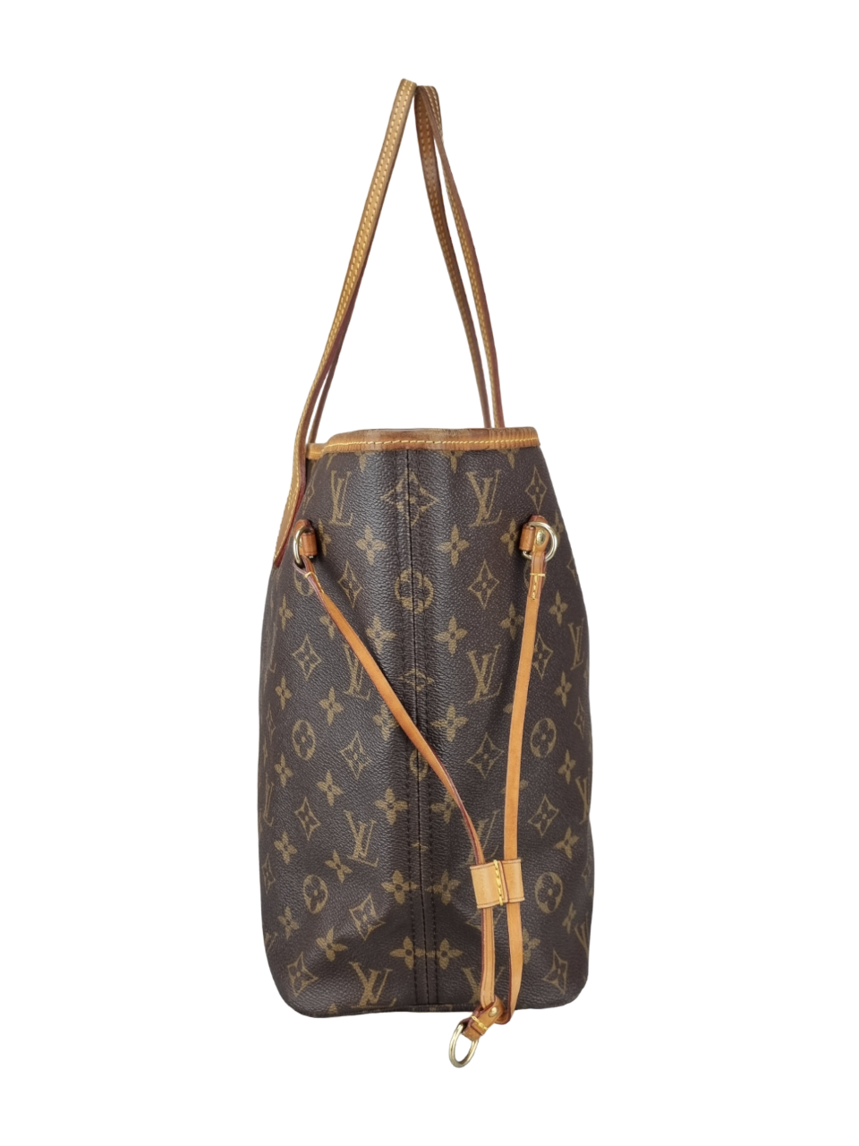 Louis Vuitton Neverfull MM Monogram in fine condition with some signs of previous use and patina. The exterior is in fine condition with signs of previous wear on the leather parts of the bag, in terms of discoloration and small scratches.