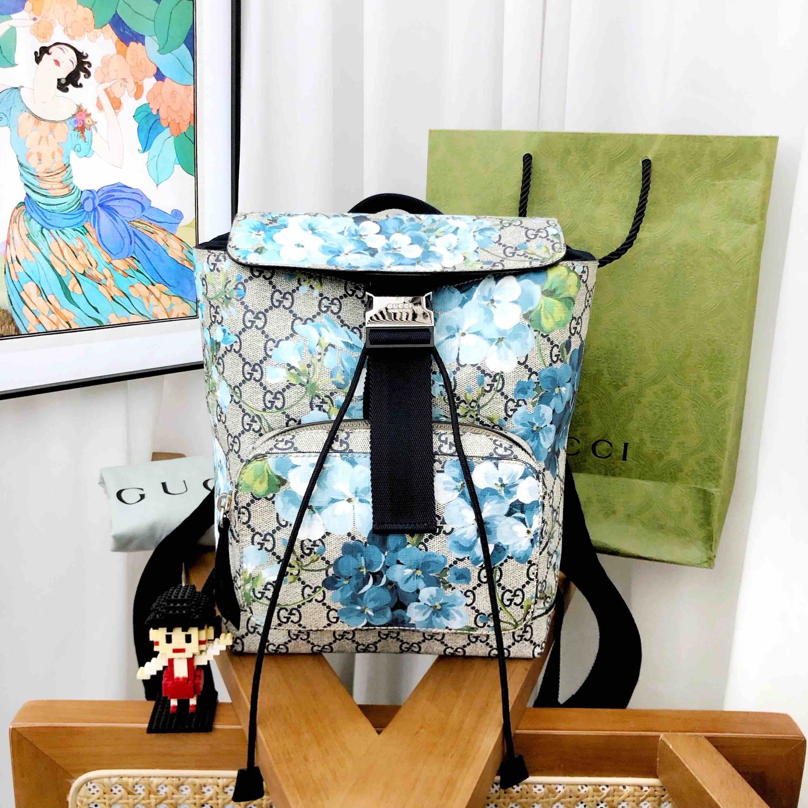 This Gucci GG Blooms Blue Canvas Backpack is a stylish accessory perfect for both casual outings and stylish adventures. Featuring the iconic GG logo pattern with vibrant floral designs, it offers a striking look. Its medium size provides ample space, making it a standout choice for those who appreciate vintage Gucci bags and used designer handbags. The backpack has a leather strap and silver hardware, ensuring durability and elegance.