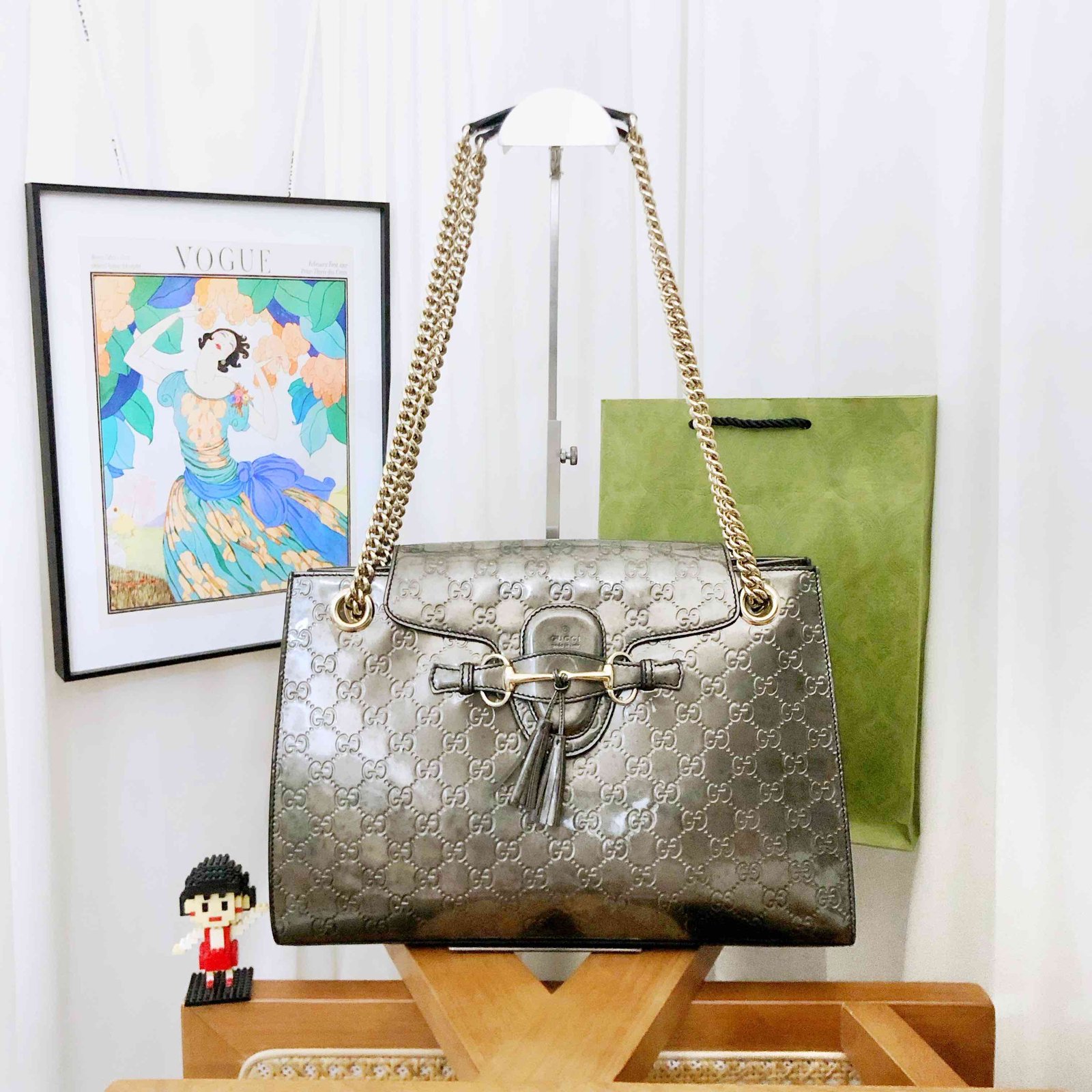 This used Gucci Emily Shoulder Bag in Metallic Grey is a stunning addition for vintage bag enthusiasts. Crafted from luxurious embossed leather, this designer handbag features a chic chain strap in gold, elegantly complementing its metallic finish. The beige leather interior provides ample space for your essentials, making it a perfect blend of style and functionality. Whether you’re a collector or simply adore vintage Gucci bags, this piece is a highlight among used designer handbags.