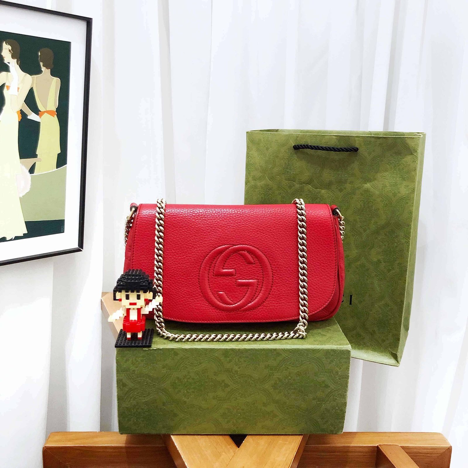 This vintage Gucci Soho shoulder bag is a chic addition to any collection of used designer handbags. Crafted from vibrant red leather, this elegant piece features a prominent GG logo, gold chain strap, and well-maintained fabric lining. Perfect for fashion enthusiasts who value style and practicality, this medium-sized bag stands out among vintage Gucci bags with its sophisticated appeal.