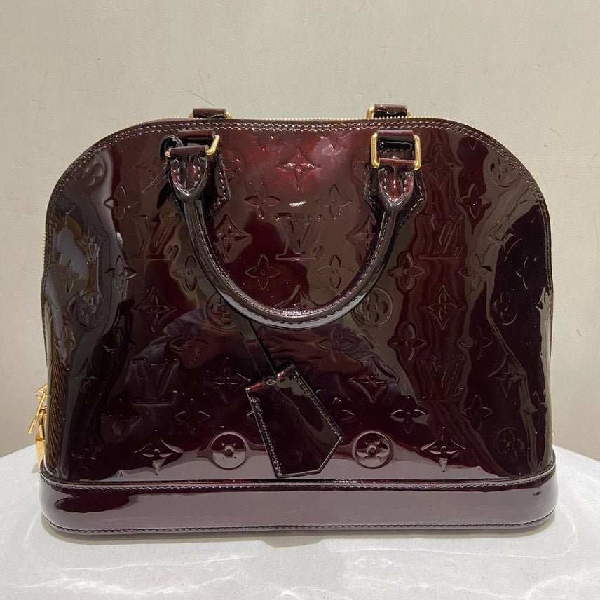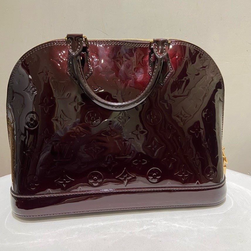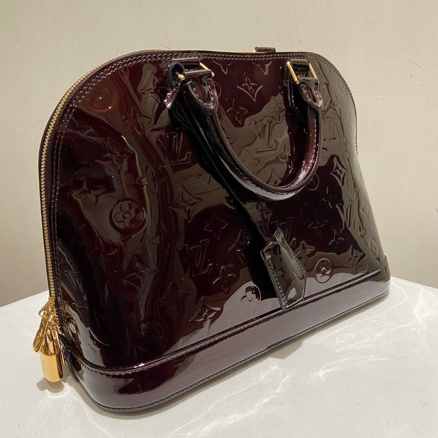This stunning used Louis Vuitton Patent Alma PM in alluring Amarante captures the essence of vintage Louis Vuitton bags. Crafted from glossy patent leather, this bag features the iconic LV monogram pattern. It includes gold-tone hardware, sturdy leather handles, and a clochette accessory. Lined with soft beige leather, it offers a spacious interior for essentials. Ideal for collectors or enthusiasts of used designer handbags.
