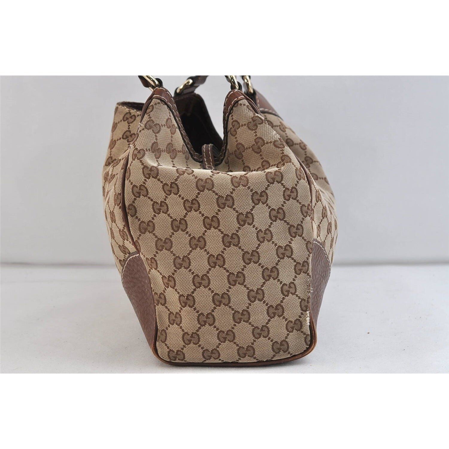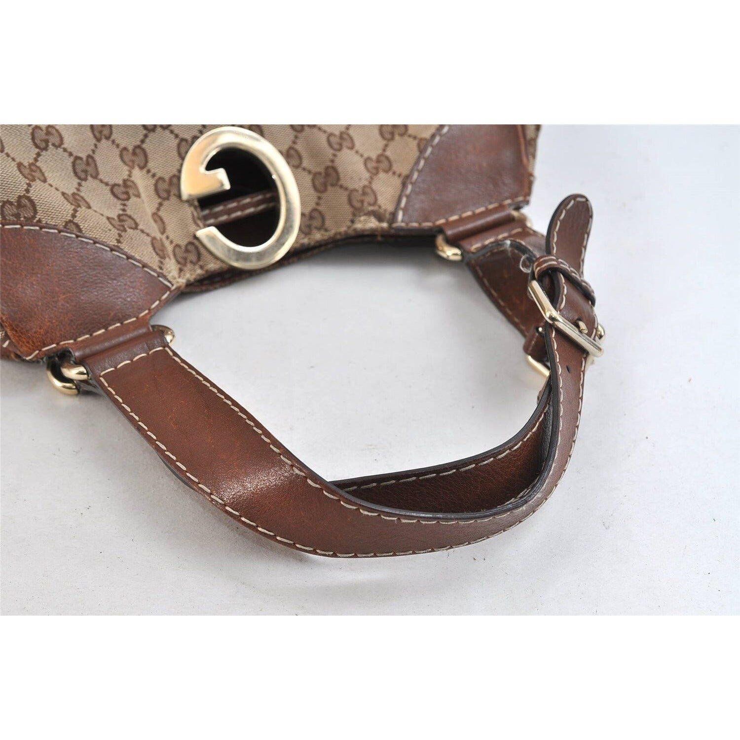 The bag is made of brown Guccissima or large ‘G’ style logo print canvas and brown leather with chrome hardware. It has two leather handles that attach to the two large solid gold Gs on one side- see pictures- and have a buckle to adjust their length on the other side. The tote has leather straps, leather trim along the bottom, leather corners, and a leather lined interior top. It has snaps on both sides that would allow it to hold less or expand – see pictures- and a snap top closure. The purse is so chic and stylish, yet practical!