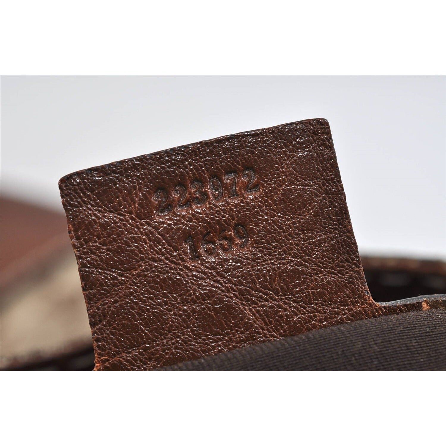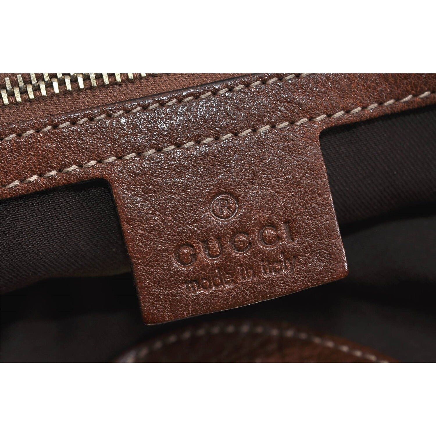 Inside, it is lined with a soft brown fabric lining that is very clean! On the interior, there is one large compartment with slot and a zip close pockets to keep you organized. The zipper has a brown leather pull and there is a tag with ‘Gucci Made in Italy’ embossed on one side and the serial #223972 1559 embossed on the back- see pictures!