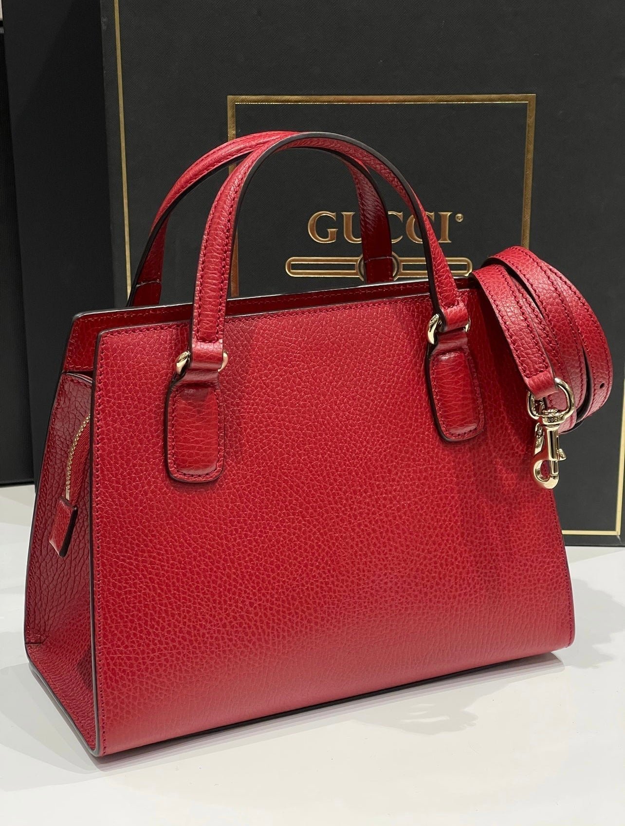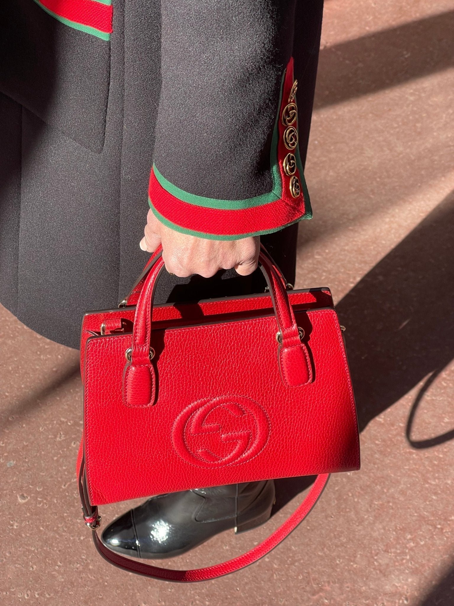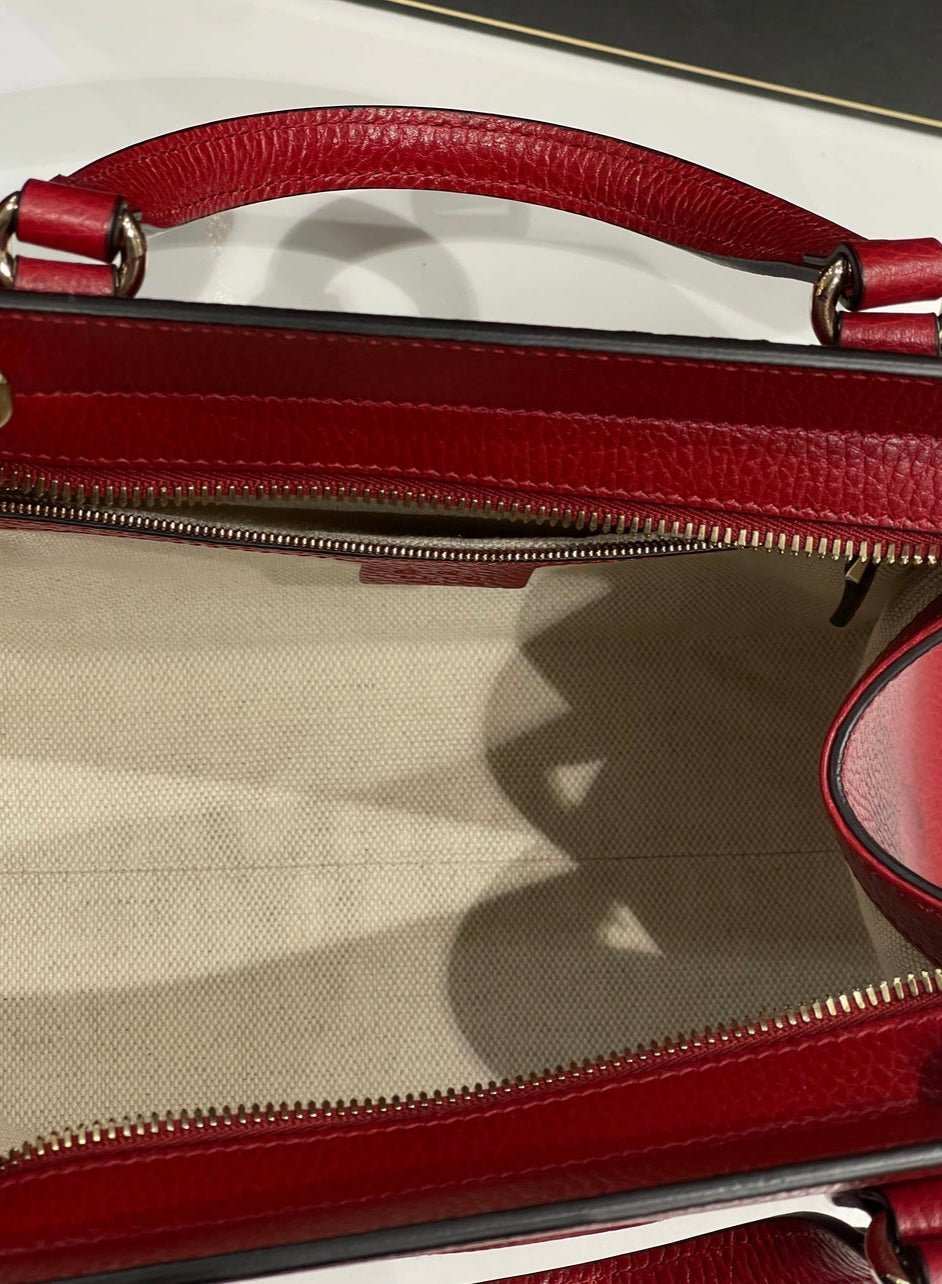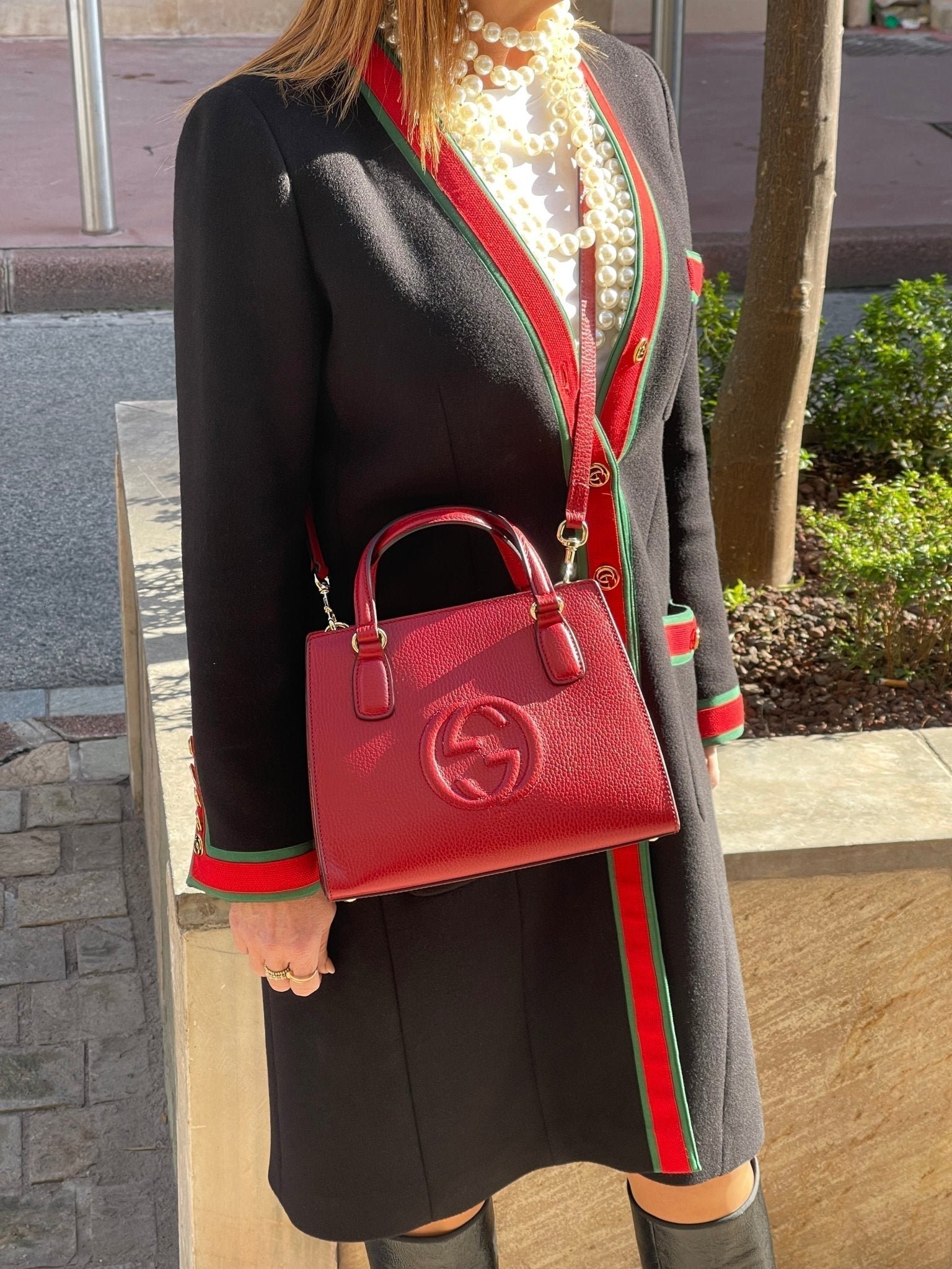 Élégant sac cabas Soho en cuir grainé rouge, double poignée, une anse bandoulière réglable permettant un porté main, épaule ou bandoulière.