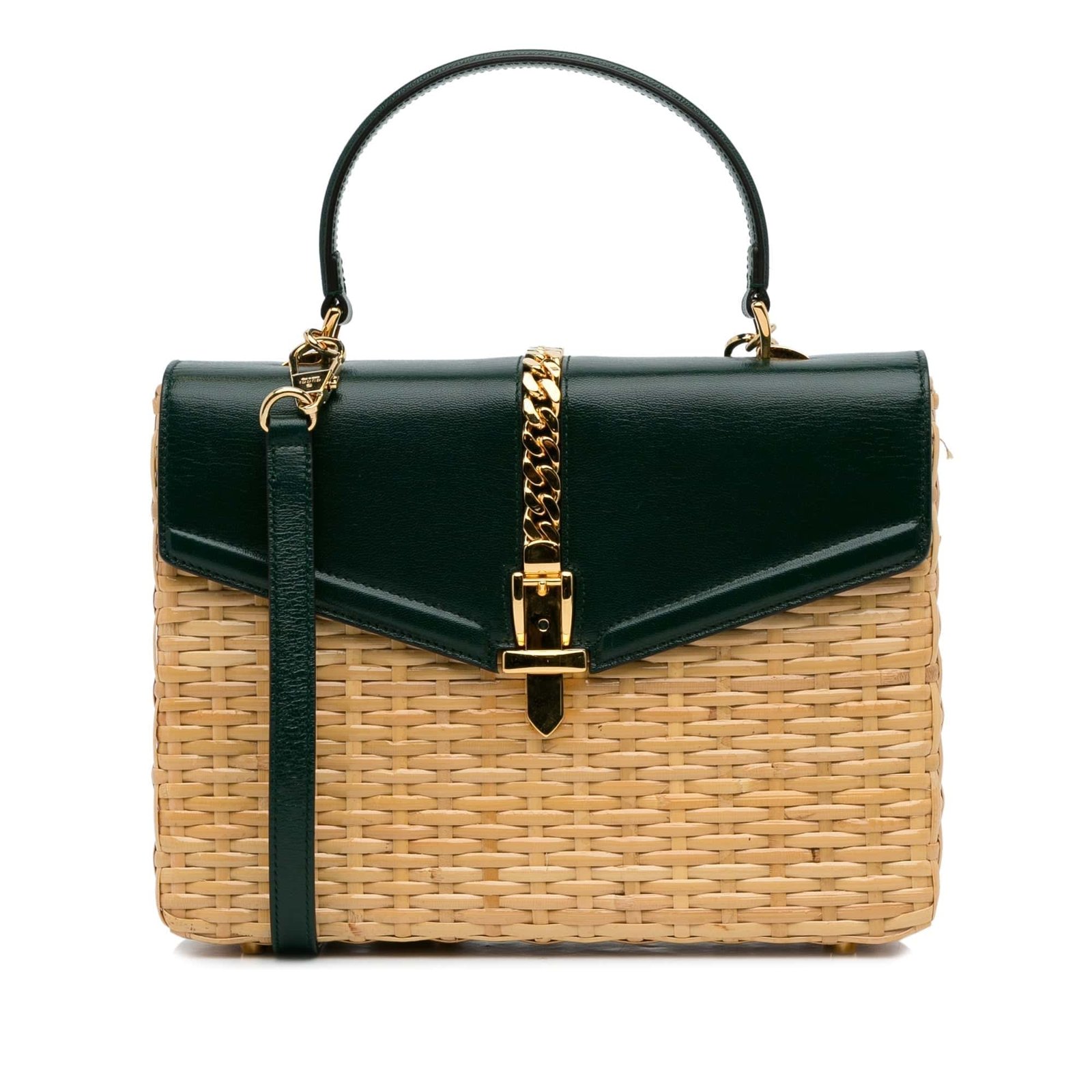 The Sylvie has a wicker body, a flat leather handle, a detachable leather shoulder strap, a front flap with metal clasp and inner compartments.