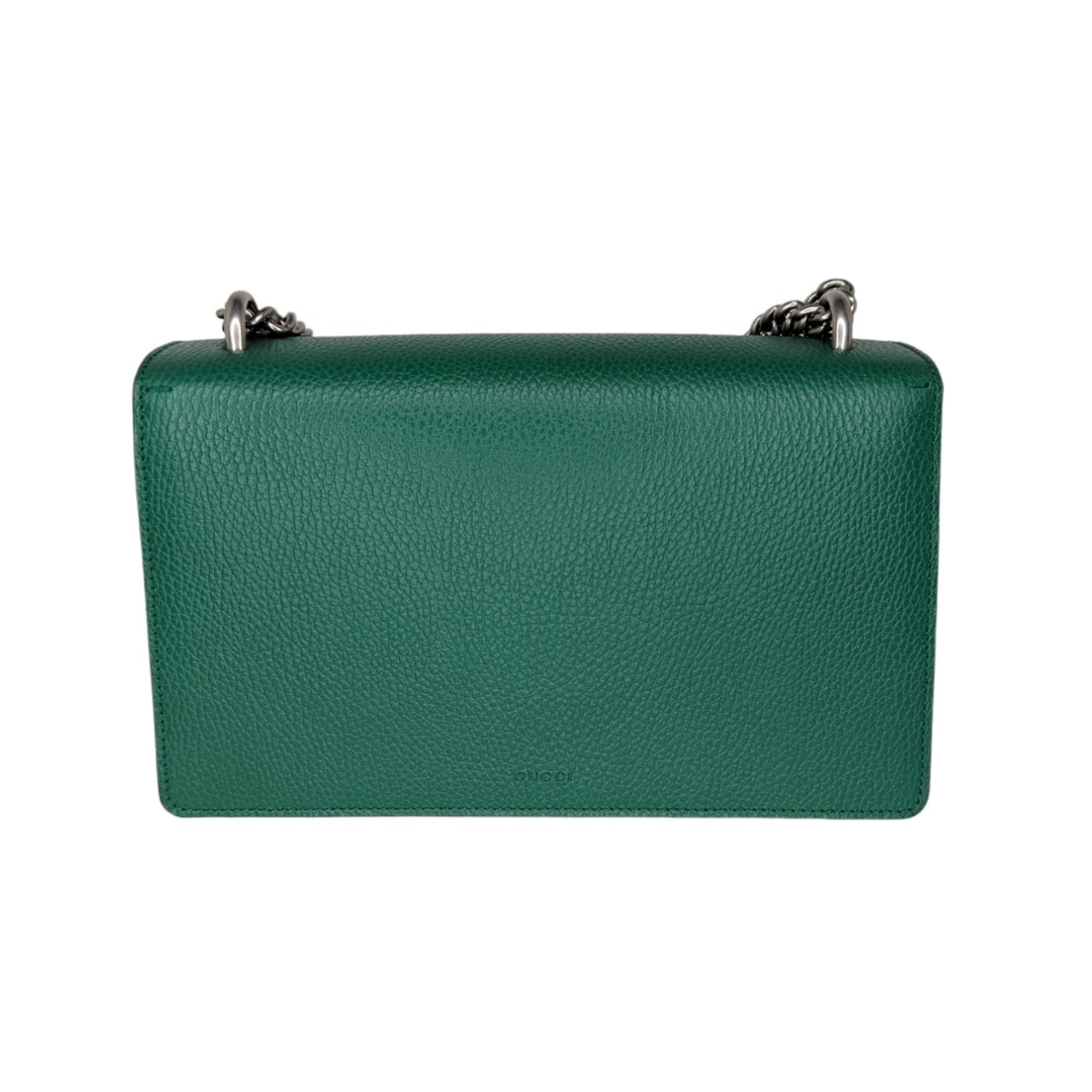 The Dionysus shoulder Bag with the now defining tiger head closure-a unique detail referencing the Greek god Dionysus, who in myth is said to have crossed the river Tigris on a tiger sent to him by Zeus. The closure is further enhanced with green crystals. The sliding chain strap can be multiple ways, changing between a shoulder and a top handle Bag. Made in textured, resistant leather.