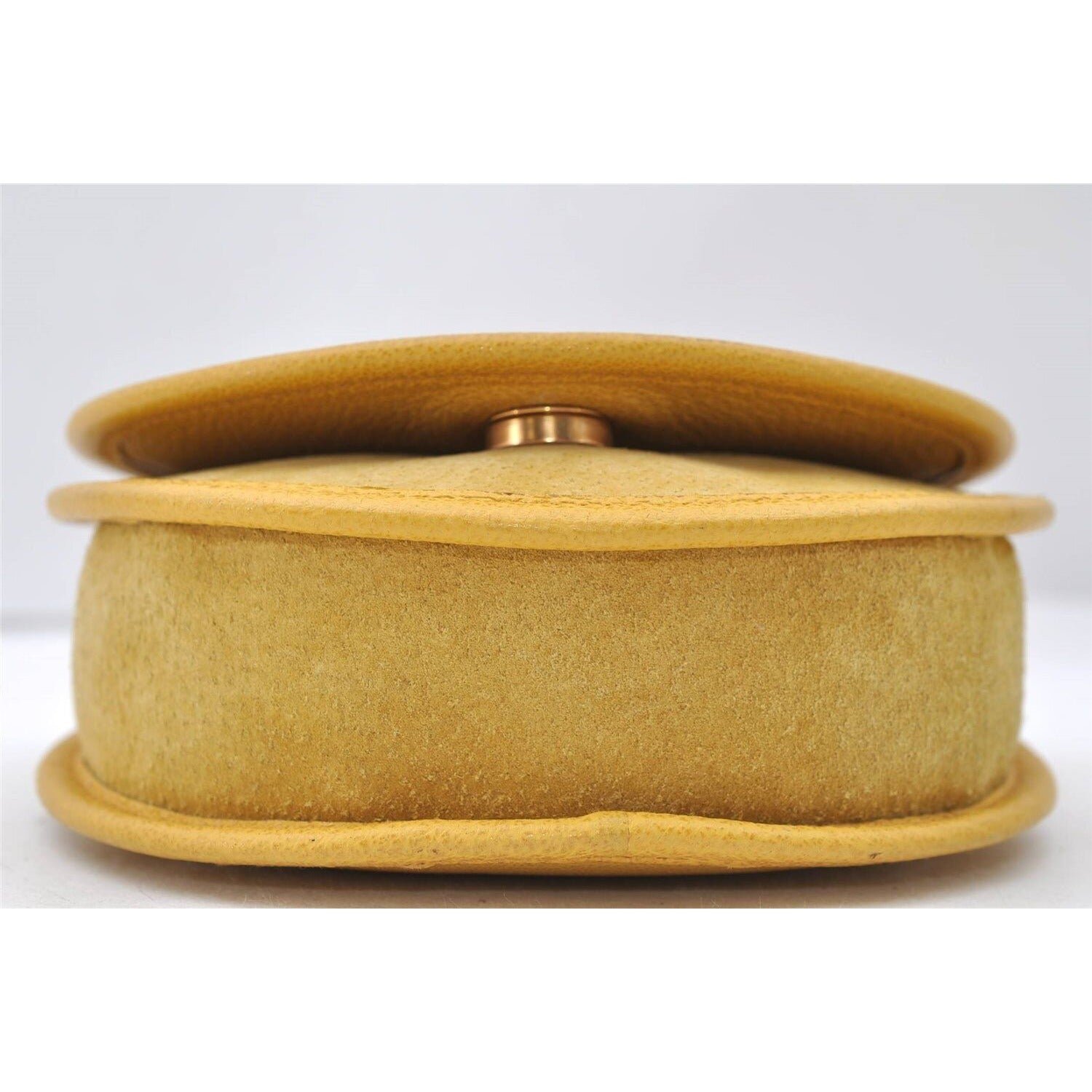 Gucci has rereleased this purse with the 1955 horse-bit line calling it the Gucci 1955 Horse-bit Mini Rounded Bag. The bag is a petite size, but it is wide at the bottom and holds more than you might think. The piece is made of super soft, golden yellow leather & suede. There is a gold horse bit accent on the envelope top. It has one interior compartment and two loops on the back that can be attached to a belt or a cross body strap. The hardware is polished gold. This is a perfect versatile bag for everyday and/or travel!