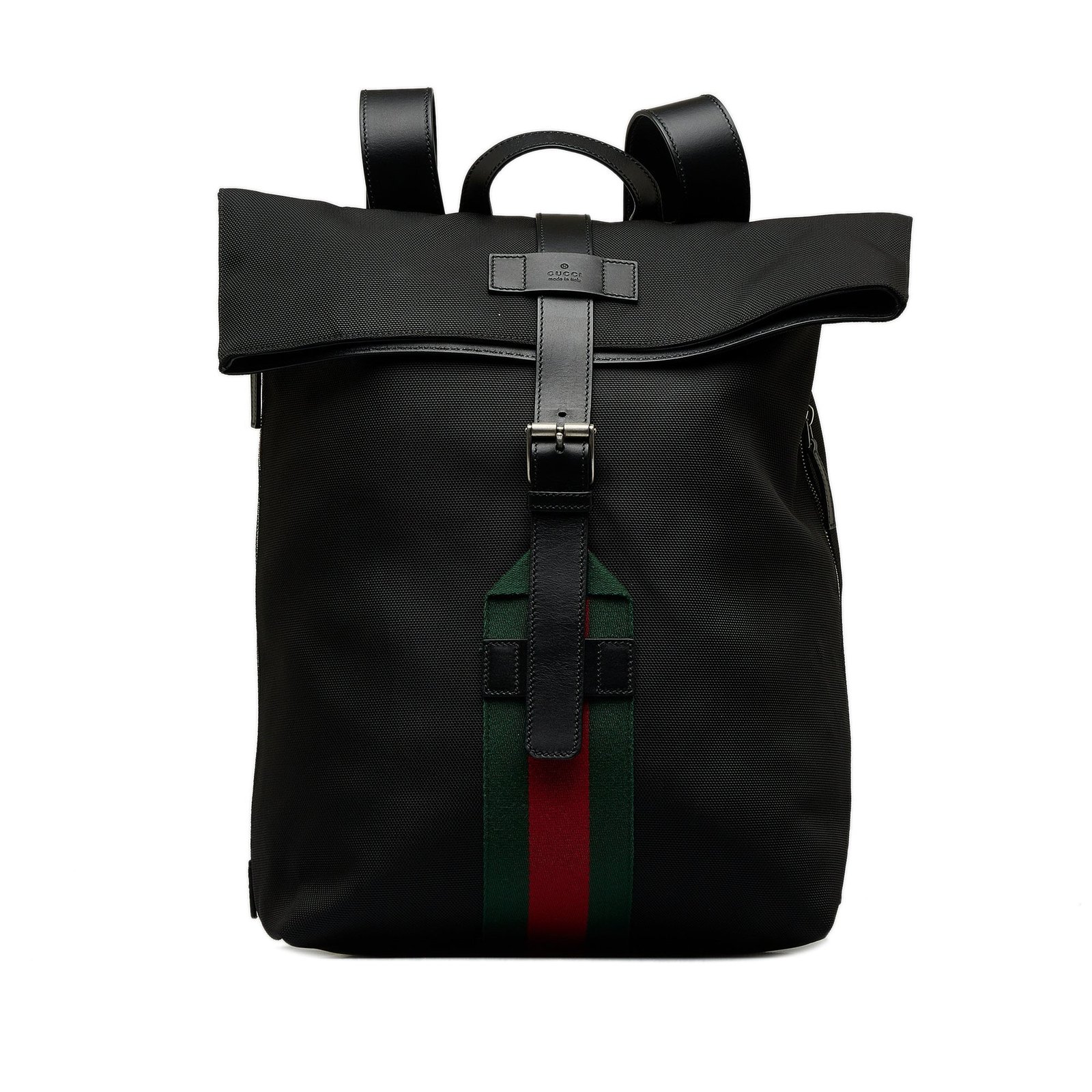 The backpack is made from black canvas, has a flat top handle, a flat, adjustable shoulder strap, a flap with buckle fastening, a drawstring closure, zipped and slip pockets on the outside and a zipped compartment on the inside.